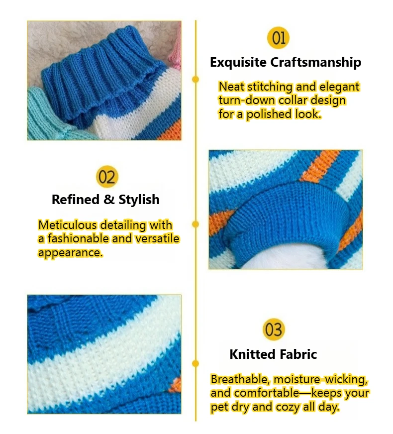 ¡Manténgase elegante y abrigado esta temporada!Confeccionado con fibras acrílicas de alta calidad, este suéter ofrece excelente transpirabilidad y comodidad para tu mascota.Su buena elasticidad garantiza un uso fácil, mientras que el diseño de cuello alto proporciona calidez adicional contra el frío.Perfecto para paseos diarios, aventuras al aire libre o momentos acogedores en casa durante los días fríos.