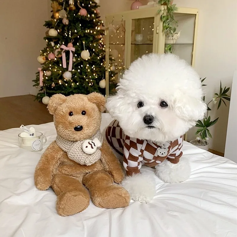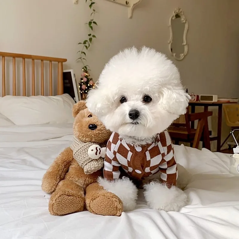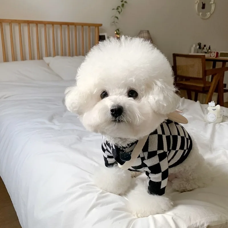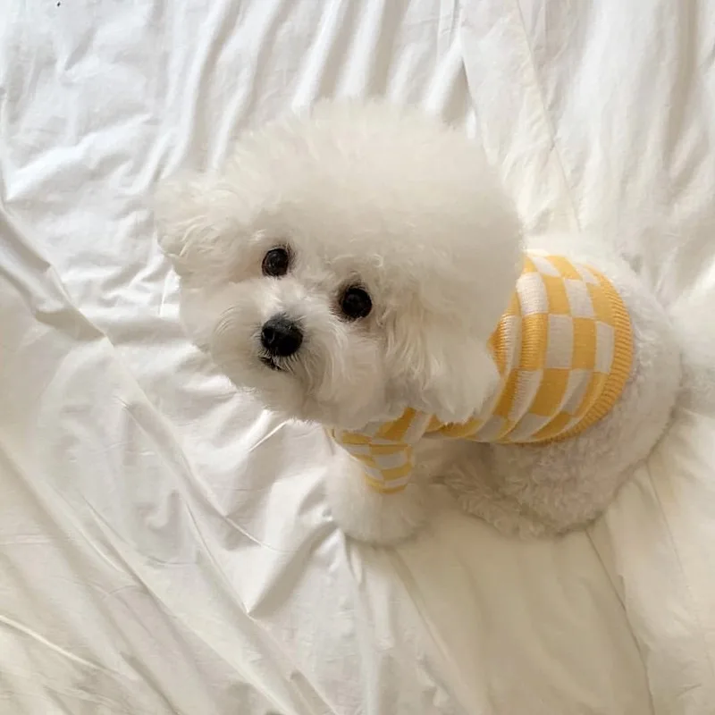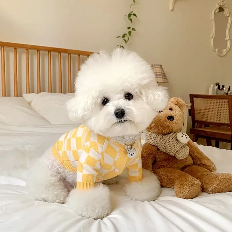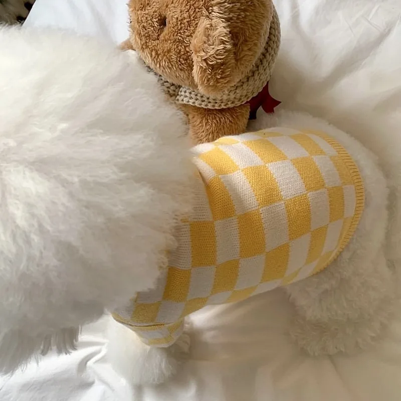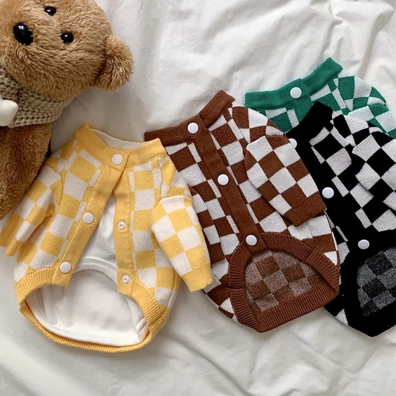 Suéter de punto para mascotas, ropa para perros con diseño de tablero de ajedrez a la moda, suministros de ropa de otoño e invierno para gatos, chaqueta con accesorios cálidos y bonitos