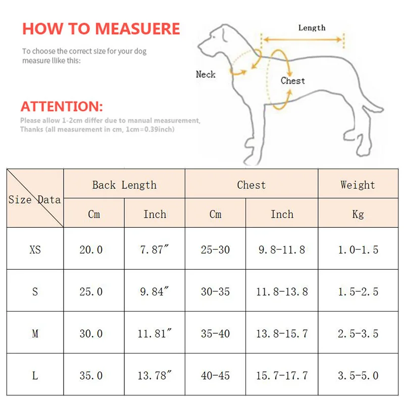 1. Por favor, compruebe las medidas de su mascota para asegurarse de que la ropa se ajuste a las mascotas antes de realizar el pedido (1 pulgada=2,54 cm)