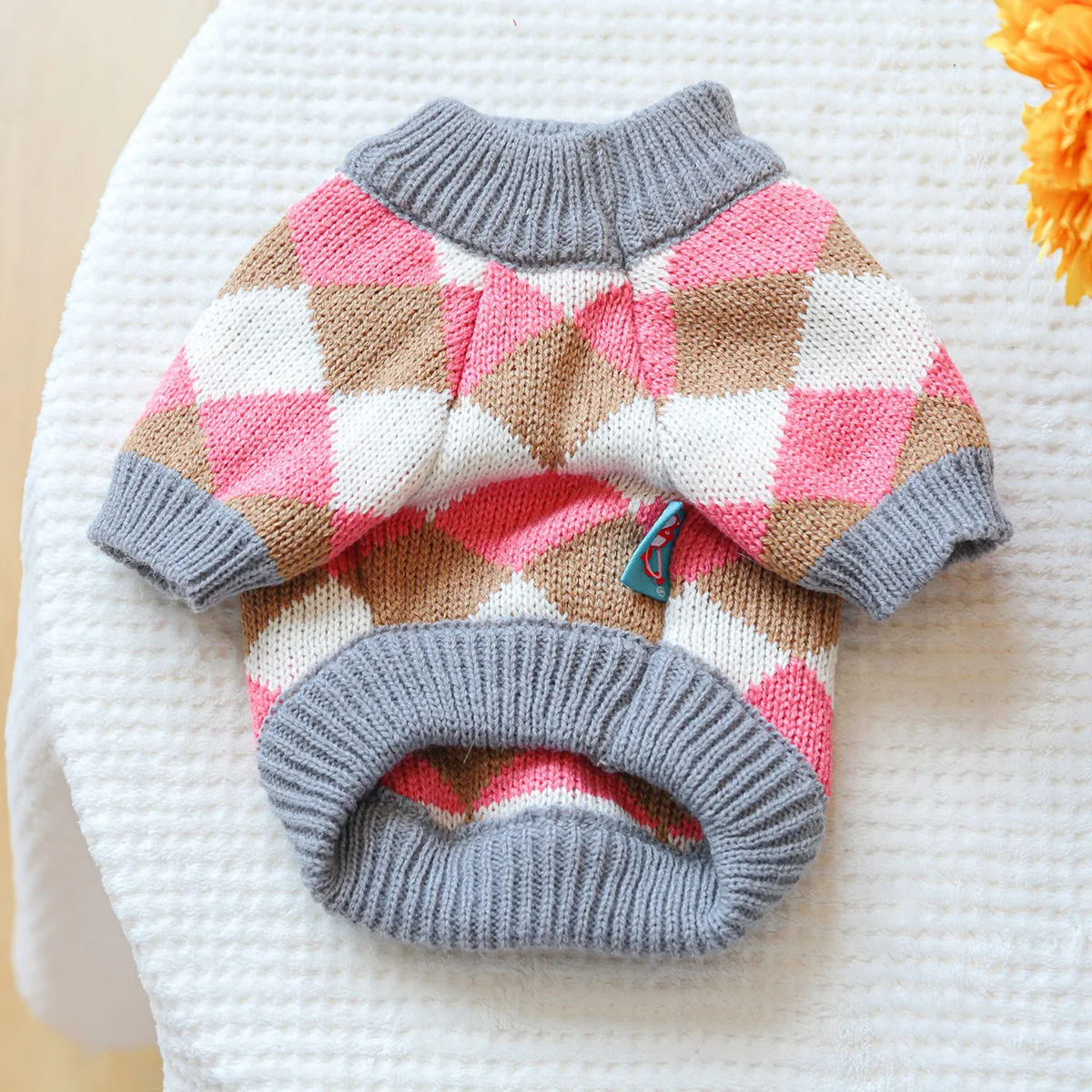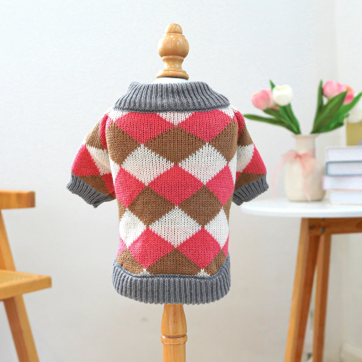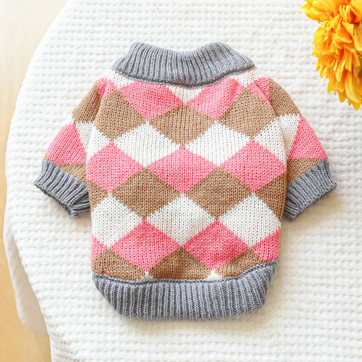 Suéter de rombos Rosa café para mascotas, ropa de invierno para cachorros y gatos, venta al por mayor, nuevo
