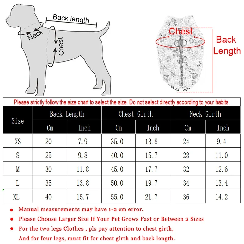 XL: Longitud de la espalda: 40 cm/15,7 pulgadas; Circunferencia del pecho: 55 cm/21,7 pulgadas; Circunferencia del cuello: 36 cm/14,2 pulgadas;