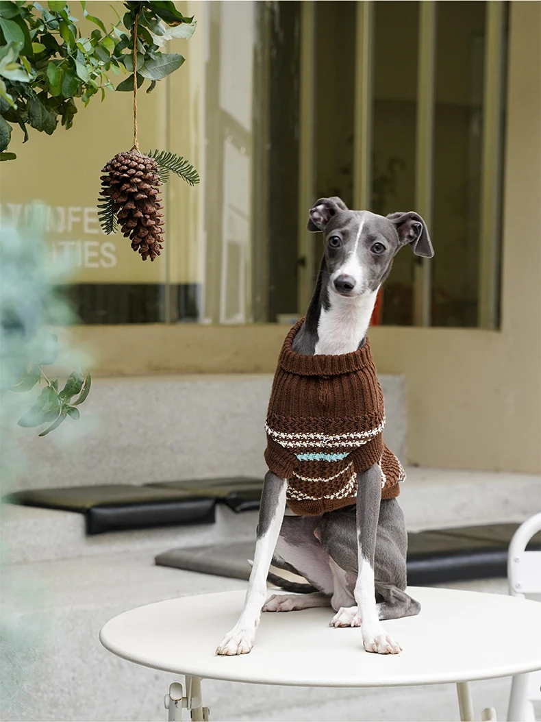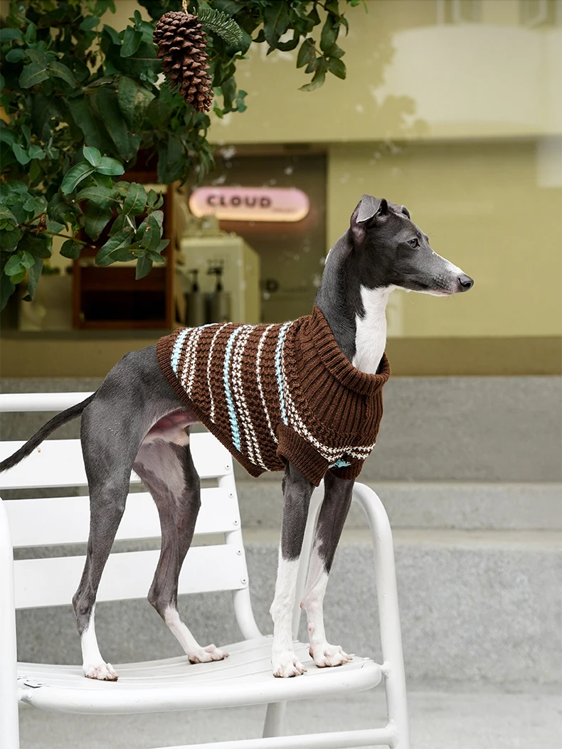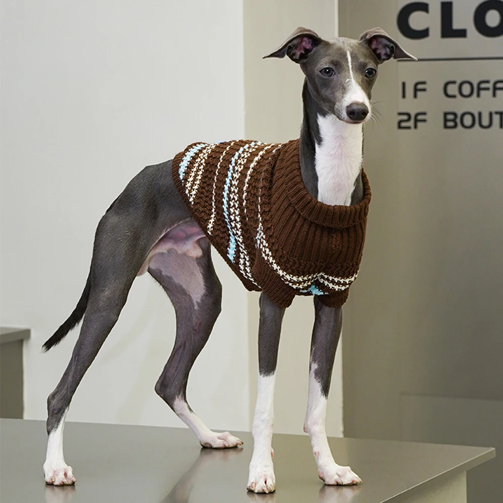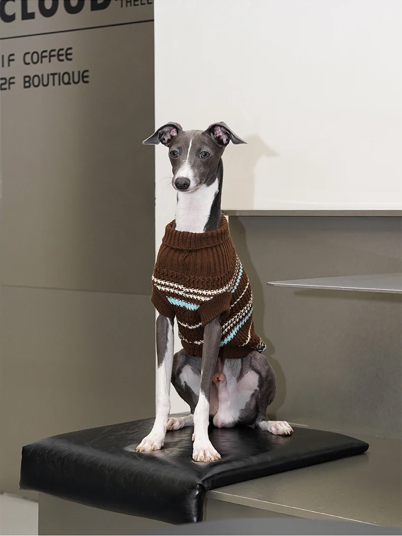 Suéter tejido a mano para gris italiano en otoño, abrigo de rayas suaves para pequeños Whippet, ropa de descanso cálida de café oscuro para perros