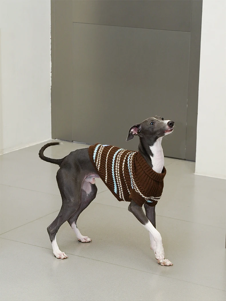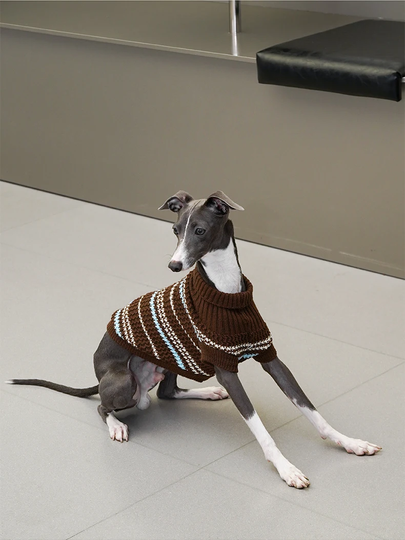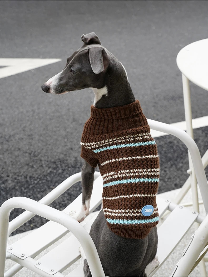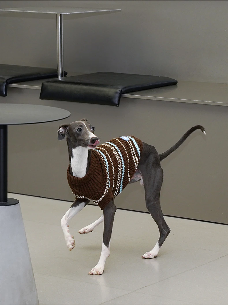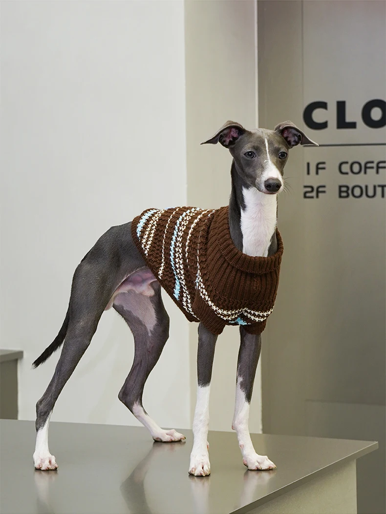 Suéter tejido a mano para gris italiano en otoño, abrigo de rayas suaves para pequeños Whippet, ropa de descanso cálida de café oscuro para perros