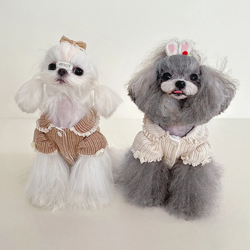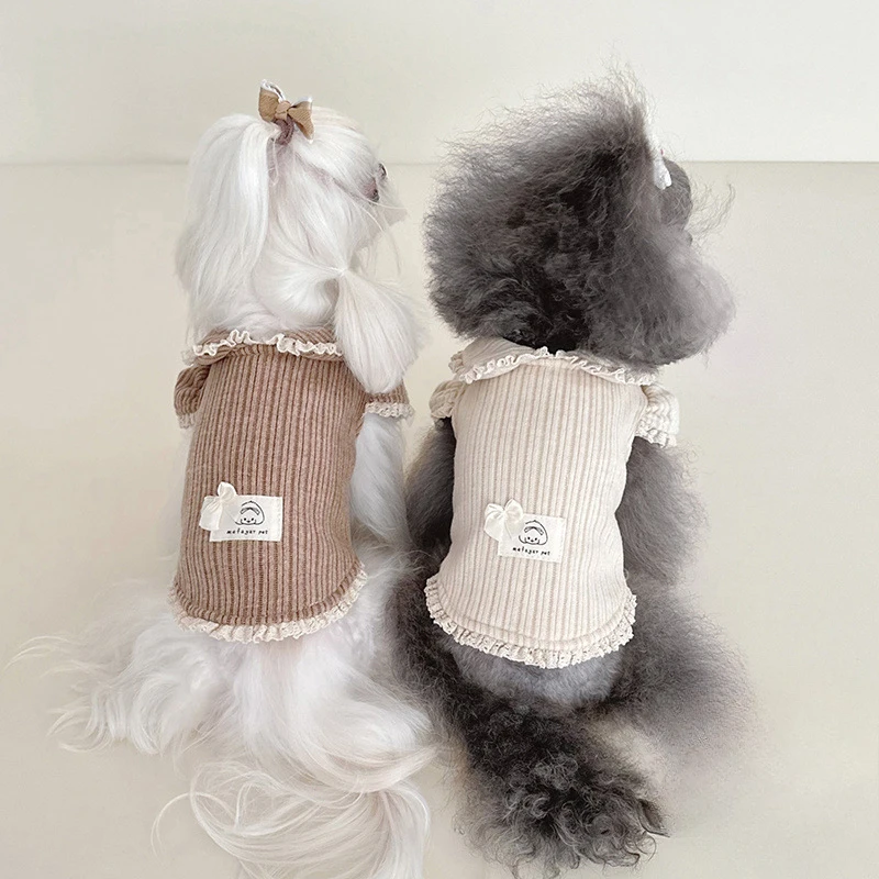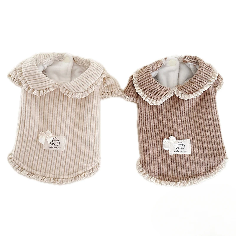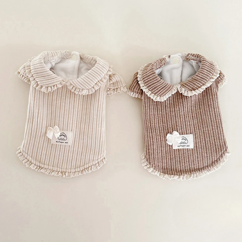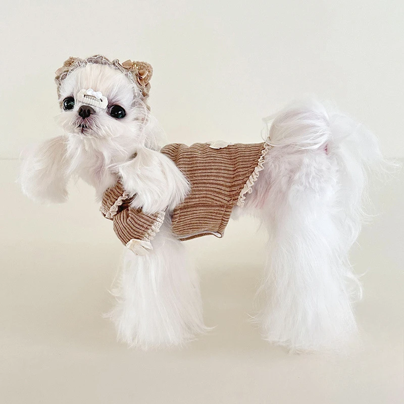 Suéter de terciopelo para cachorros con cuello de muñeca, mangas de burbuja y capucha con adornos de encaje para perros pequeños, ropa para cachorros de princesa