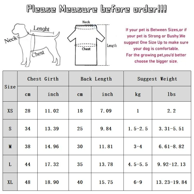 XL: Pecho 48 cm/18,9 ''; Longitud 40 cm/15,75 ''; Peso sugerido 6-9 kg/13,23-19,84 libras.