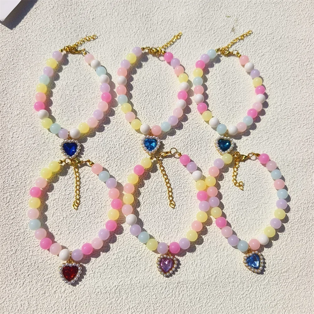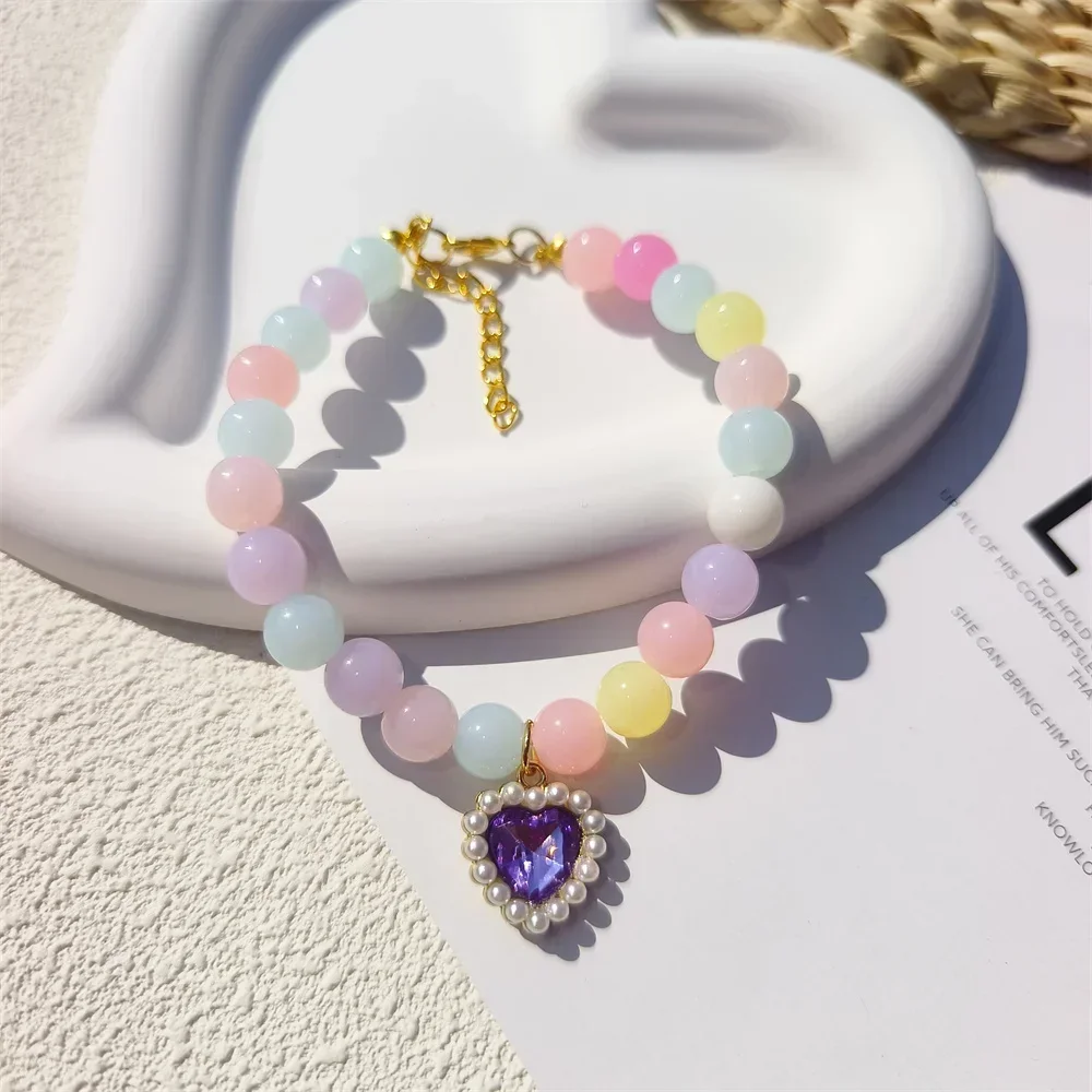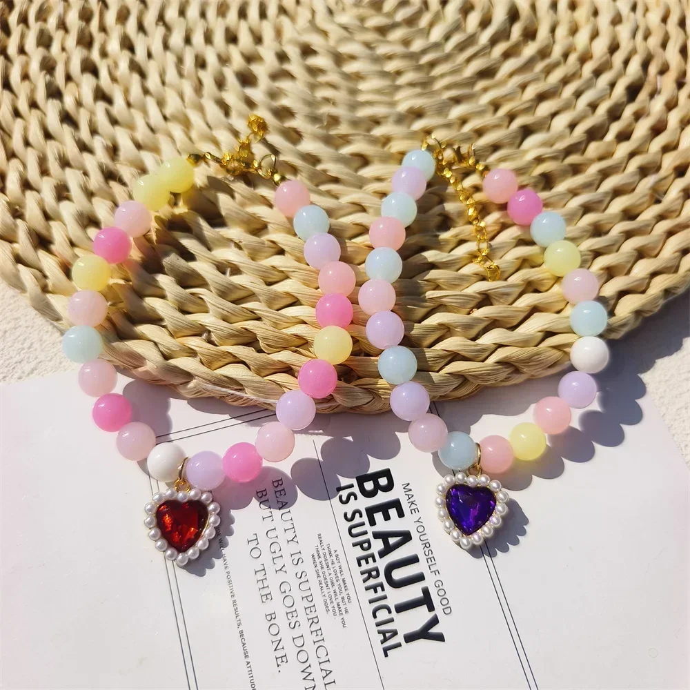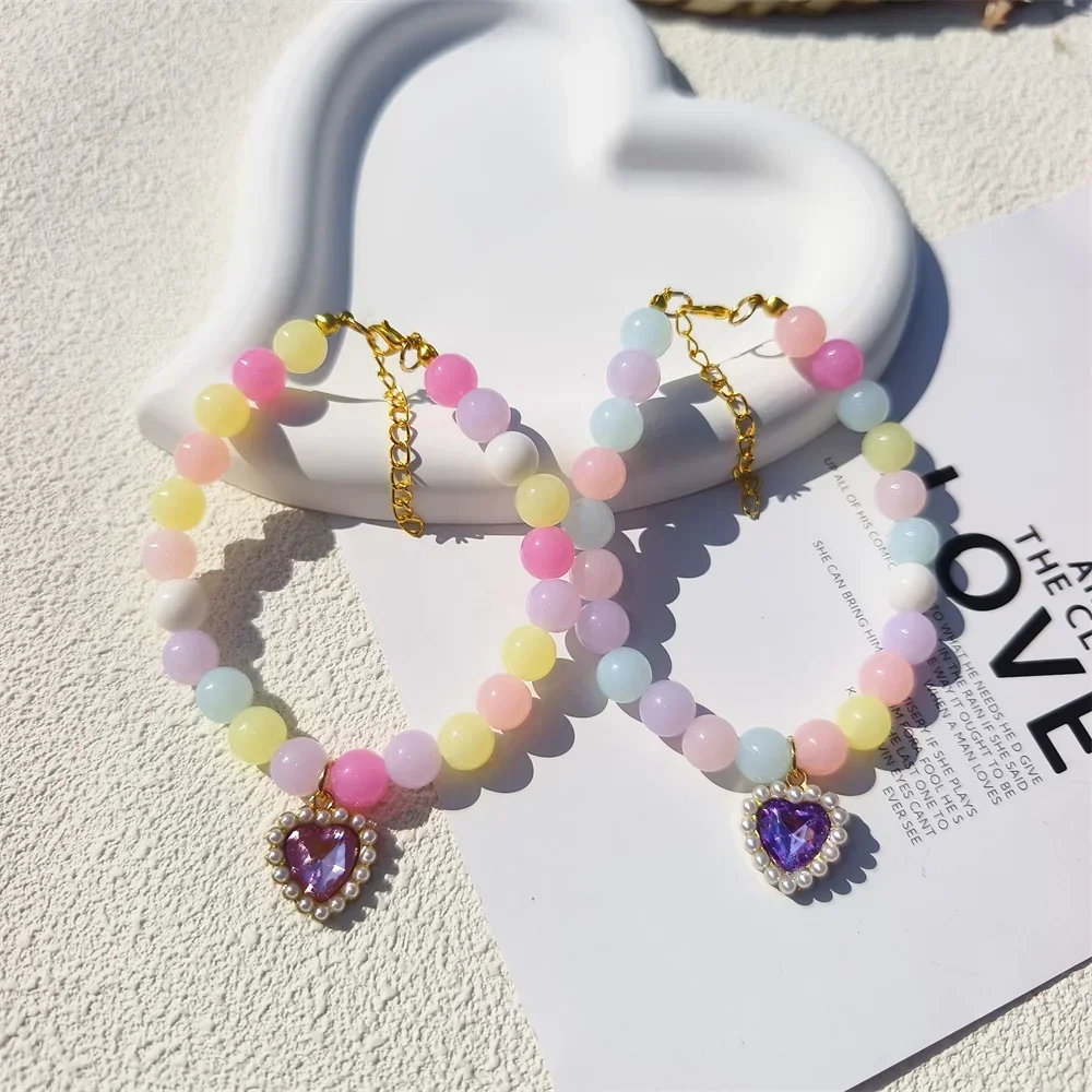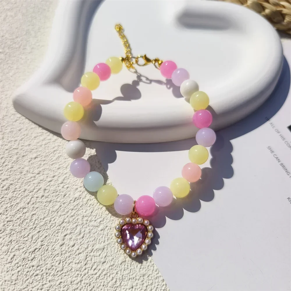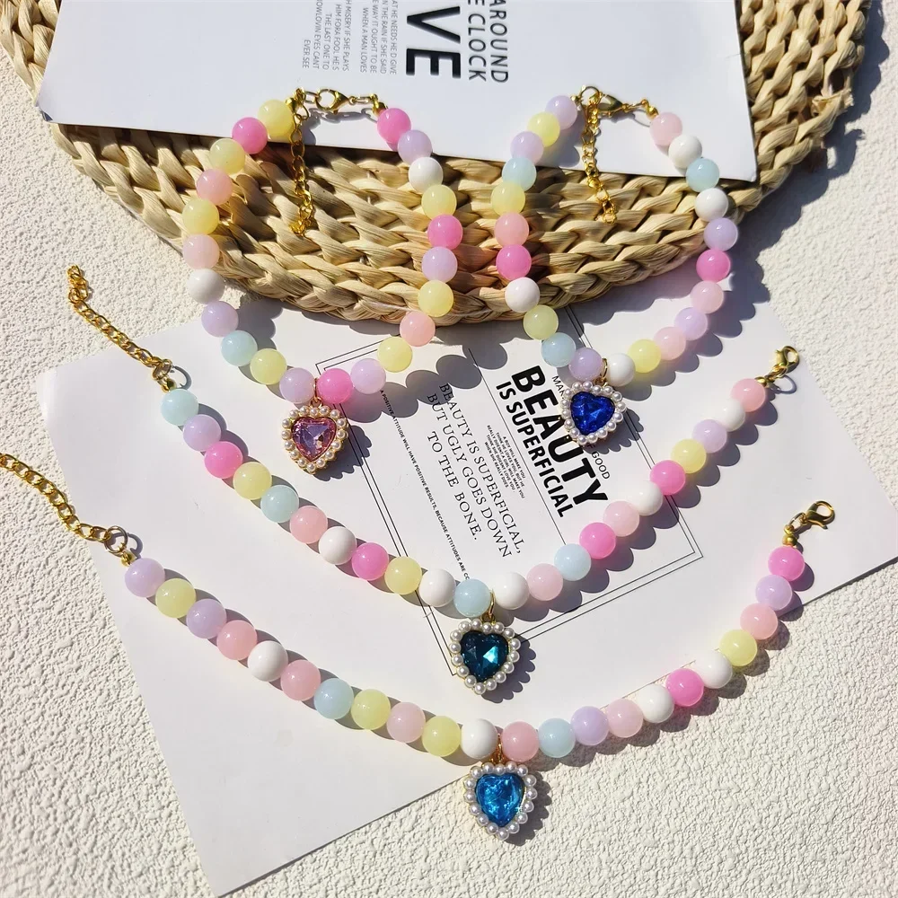 Suministros de adornos bonitos, Collar de perlas de colores gelatinosos con colgante de perlas de corazón de melocotón, Collar hecho a mano para cachorro, perro, gato, accesorios