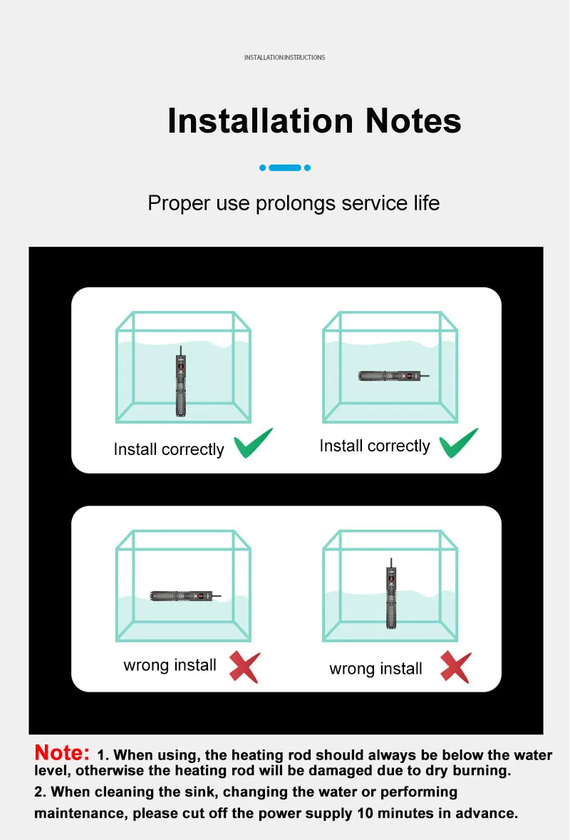 Nota: 1. Se usa Cuando, la varilla de calentamiento siempre debe estar por debajo del nivel del agua, de lo contrario la varilla de calentamiento se dañará debido a la quema en seco.