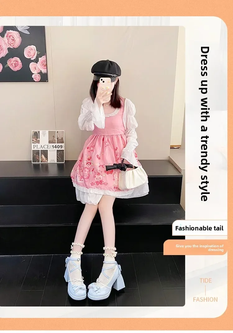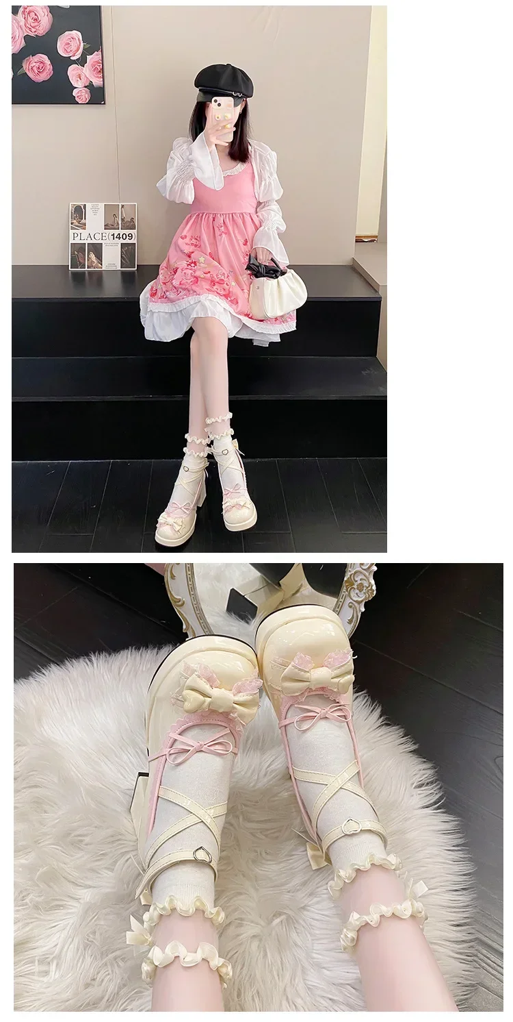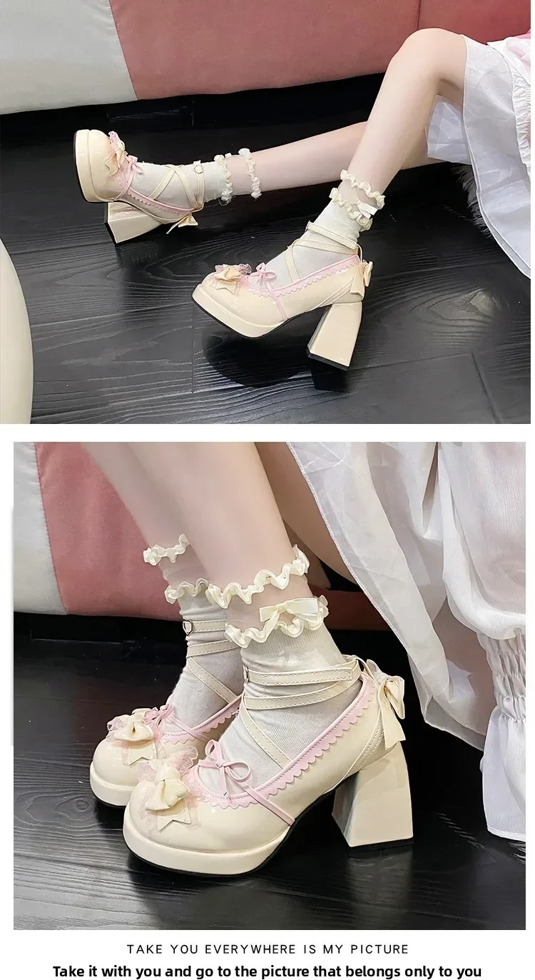 Tacones altos de tacón grueso azul, bonitos zapatos de mujer con nudo de lazo, zapatos planos de verano con plataforma a prueba de agua de Lolita dulce, mocasines con punta redonda