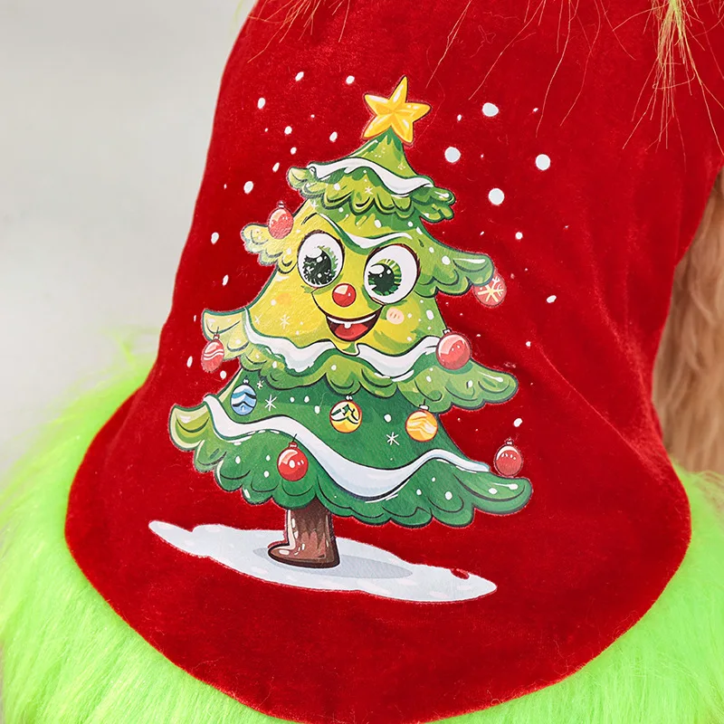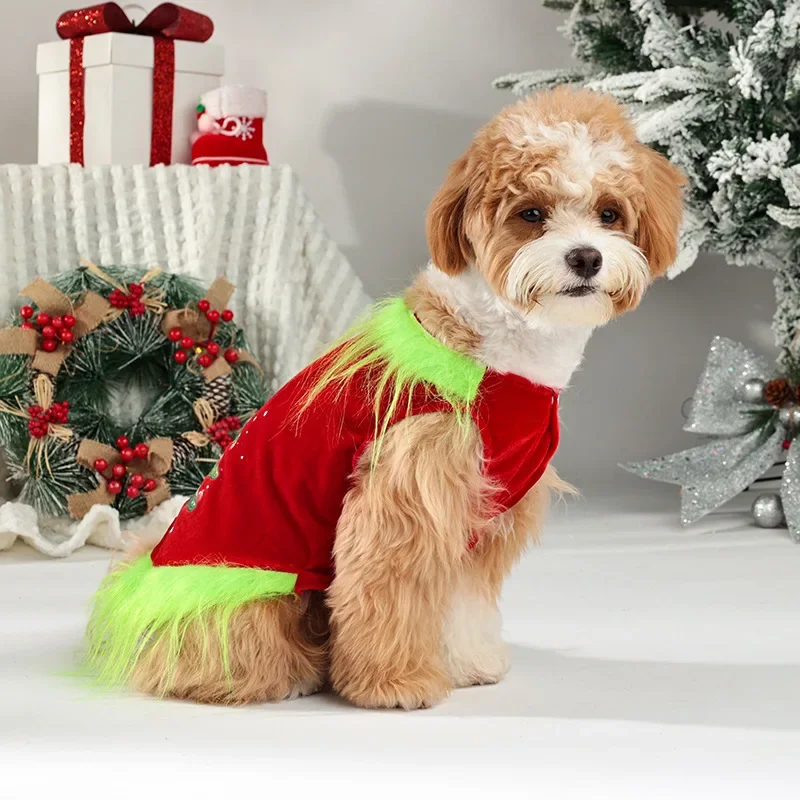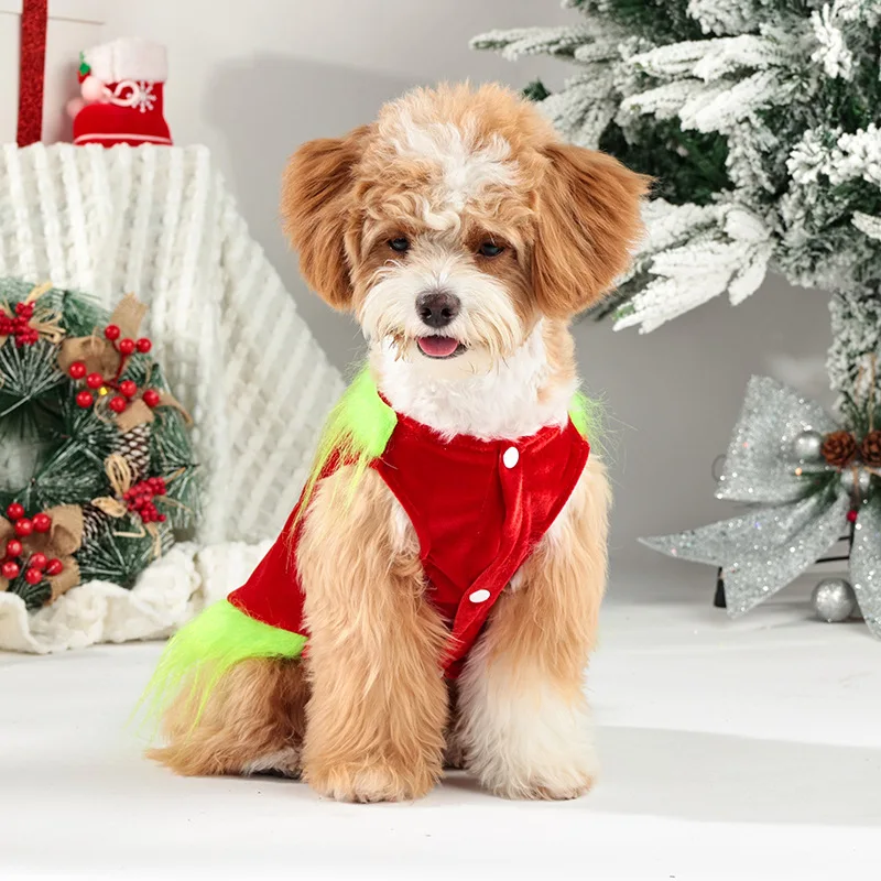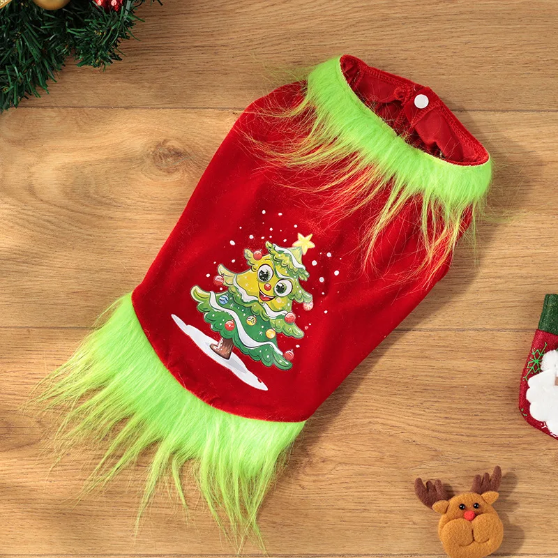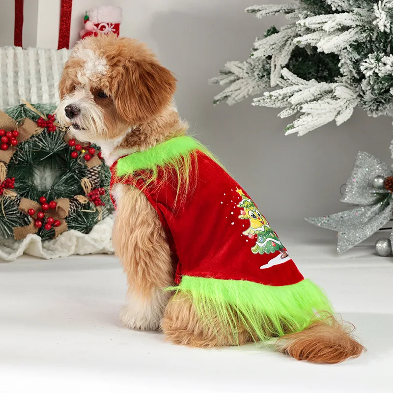 Tallas S–XL para perros pequeños y medianos Chaleco para perros con ribete peludo y árbol de Navidad, camisa navideña cálida de terciopelo, rojo/verde, flecos divertidos,