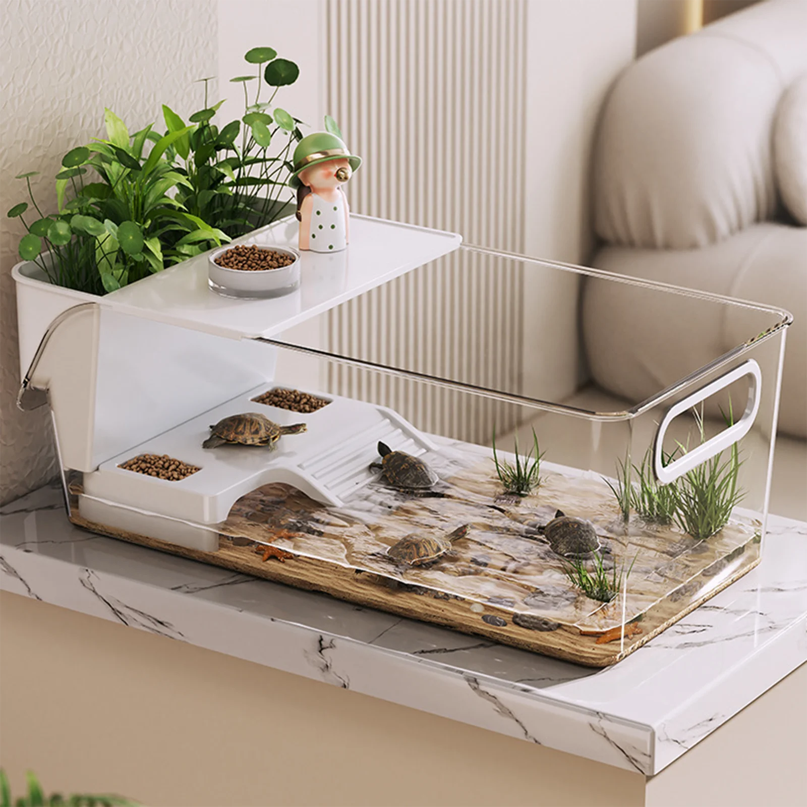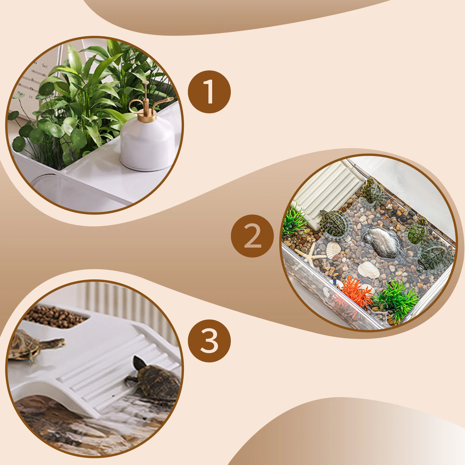 【Producto】: Diseñado específicamente como un hogar completo para tortugas pequeñas, cangrejos ermitales y otras mascotas pequeñas semiacuáticas.Este tanque de tortugas proporciona un espacio dedicado tanto para actividades acuáticas como terrestres, creando un ambiente cómodo y atractivo para su compañero.