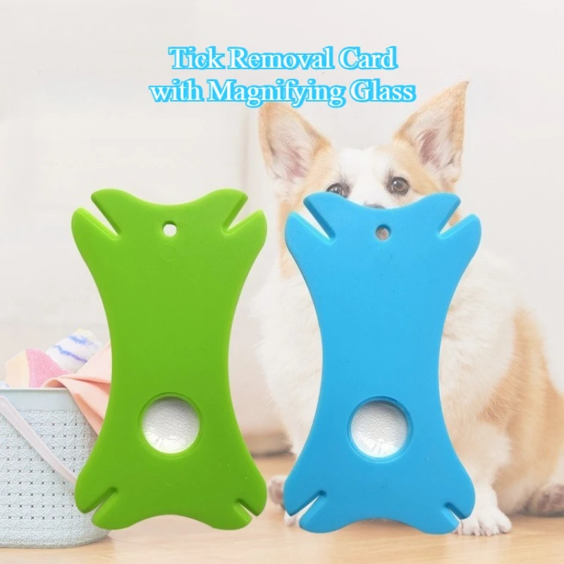 Tarjeta acrílica para eliminar garrapatas con lupa: herramienta portátil para eliminar pulgas y garrapatas para perros y gatos, tarjeta compacta de seguridad para mascotas al aire libre de 8,8 x 5 cm en azul/verde