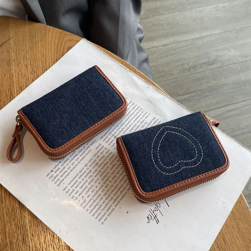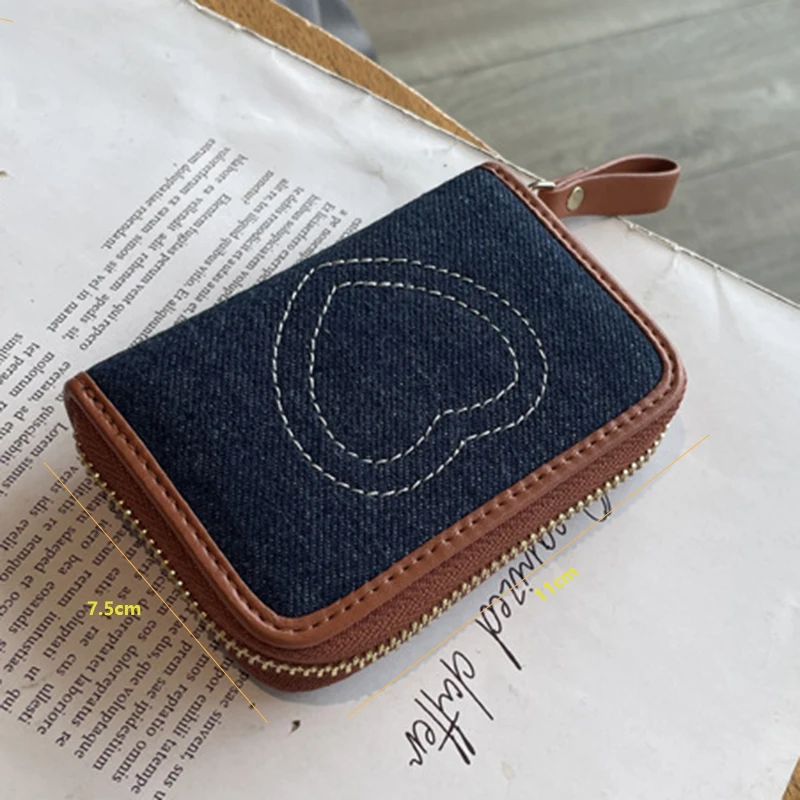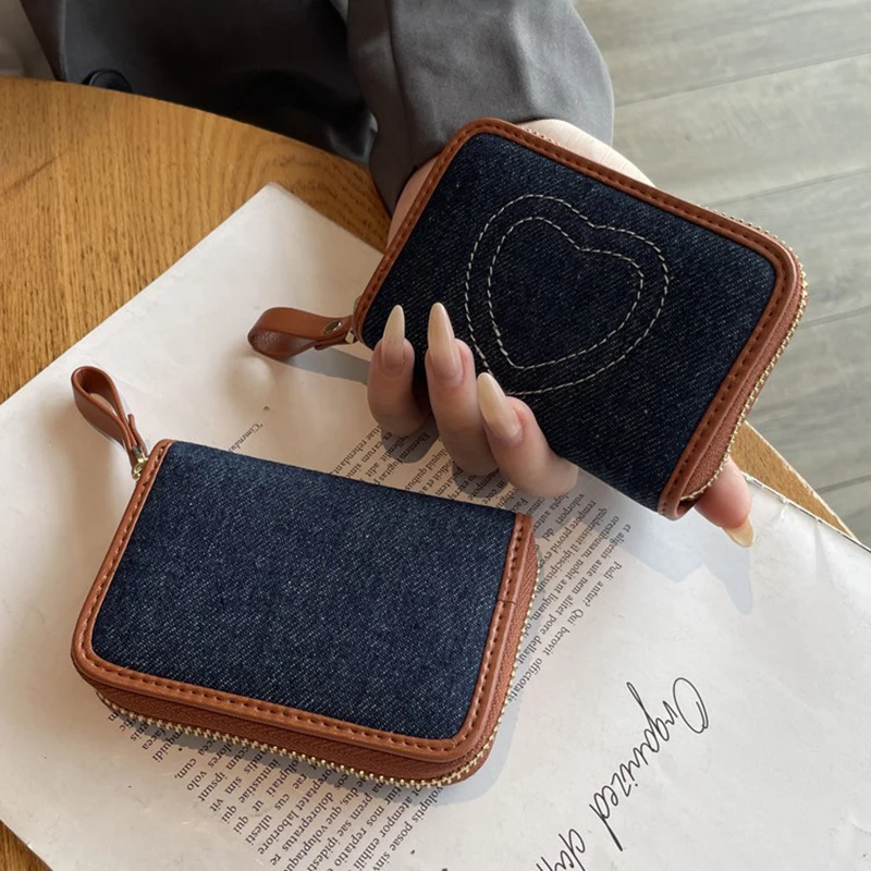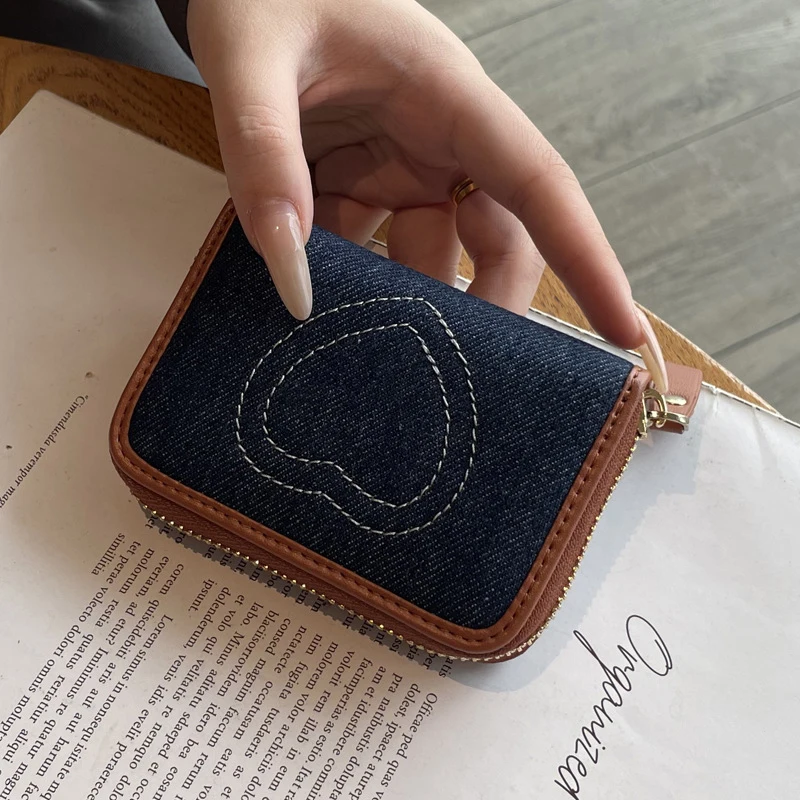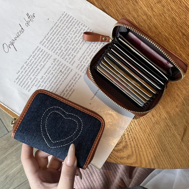 Tarjetero de identificación de mezclilla con bordado de corazón, lindo mini billetera para mujer, estuche para tarjetas con bloqueo RFID multifuncional, estilo Ins