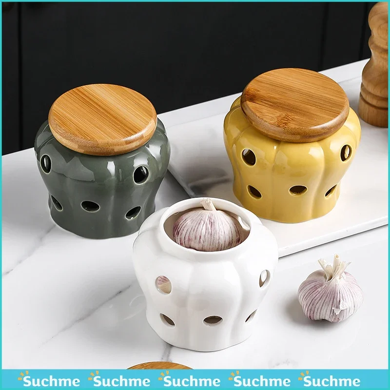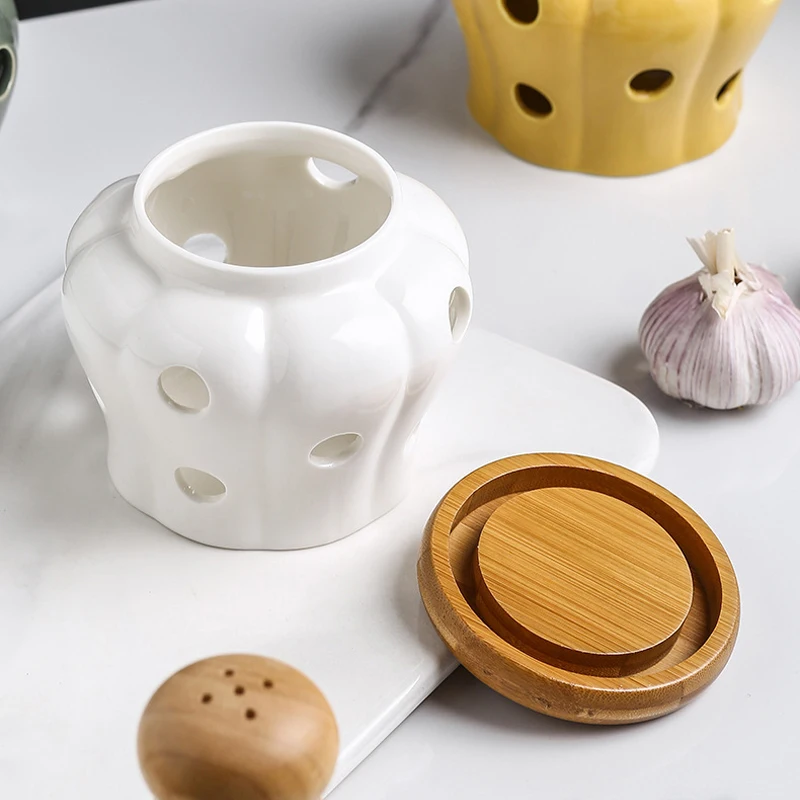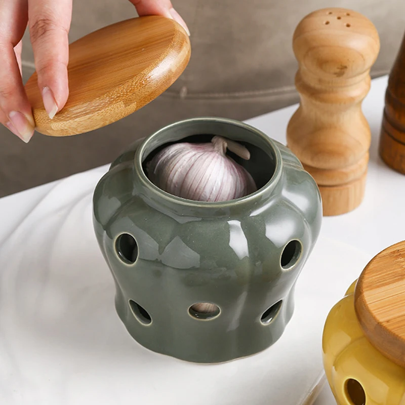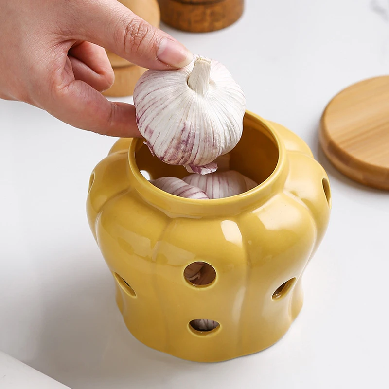 Tarro de cerámica para almacenamiento de ajo, contenedor de especias en forma de calabaza con tapa, cabeza de ajo, jengibre, Chile, pimienta, tarros de almacenamiento, vela, pantalla