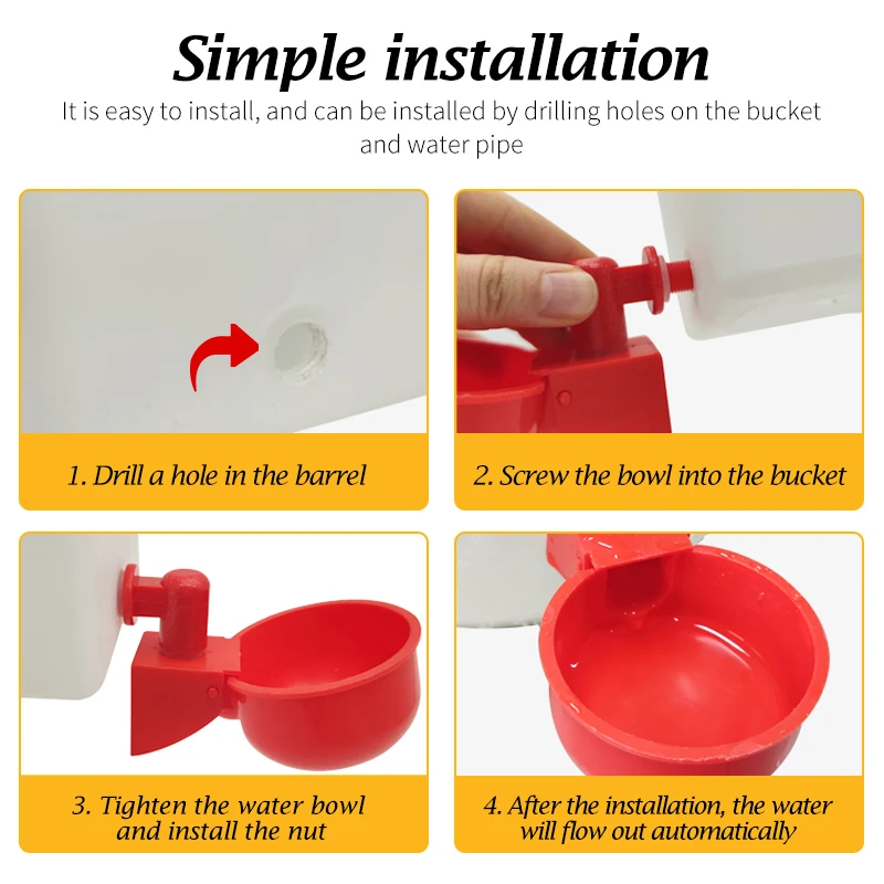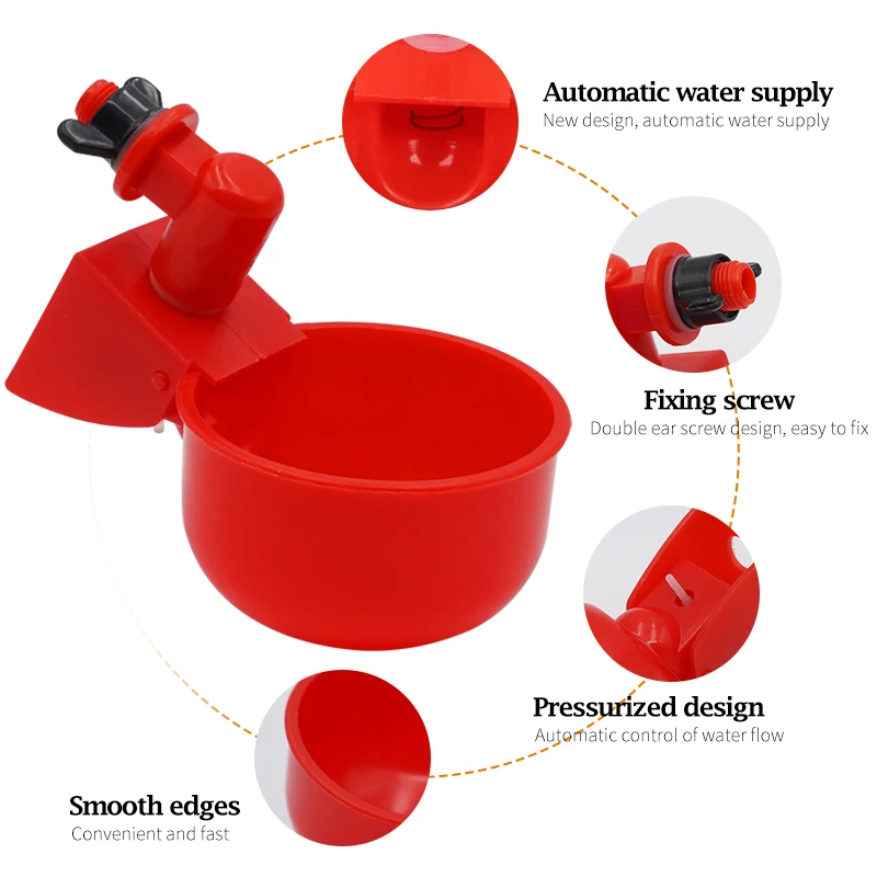 Características del producto:Característica automática: nuestro bebedero para aves de corral tiene un diseño automático, el agua puede salir automáticamente de acuerdo con la cantidad de agua en el recipiente, por lo que no tiene que enseñar sus aves a beber agua, lo cual es conveniente para su uso.Fiable de usar: estas bebederas de llenado automático están hechas de material de calidad y resorte de acero inoxidable, duraderas y resistentes, sin fugas, seguras para su uso, tampoco son fáciles de romper, puede usarlas durante mucho tiempo.Fácil de instalar y limpiar: esta taza de riego es fácil de usar, se puede conectar con un balde, tubería cómodamente, también es fácil de limpiar, la válvula de control de agua está en el interior, no hay bloqueo en el recipiente, lo que facilita limpiar.Amplia gama de usos: el bebedero está diseñado con un tamaño de taza grande, aprox.Con un diámetro de taza de 3 pulgadas, los tazones son adecuados para pollo, patos, pavoces, pájaros, etc., serán sus artículos prácticos y útiles.