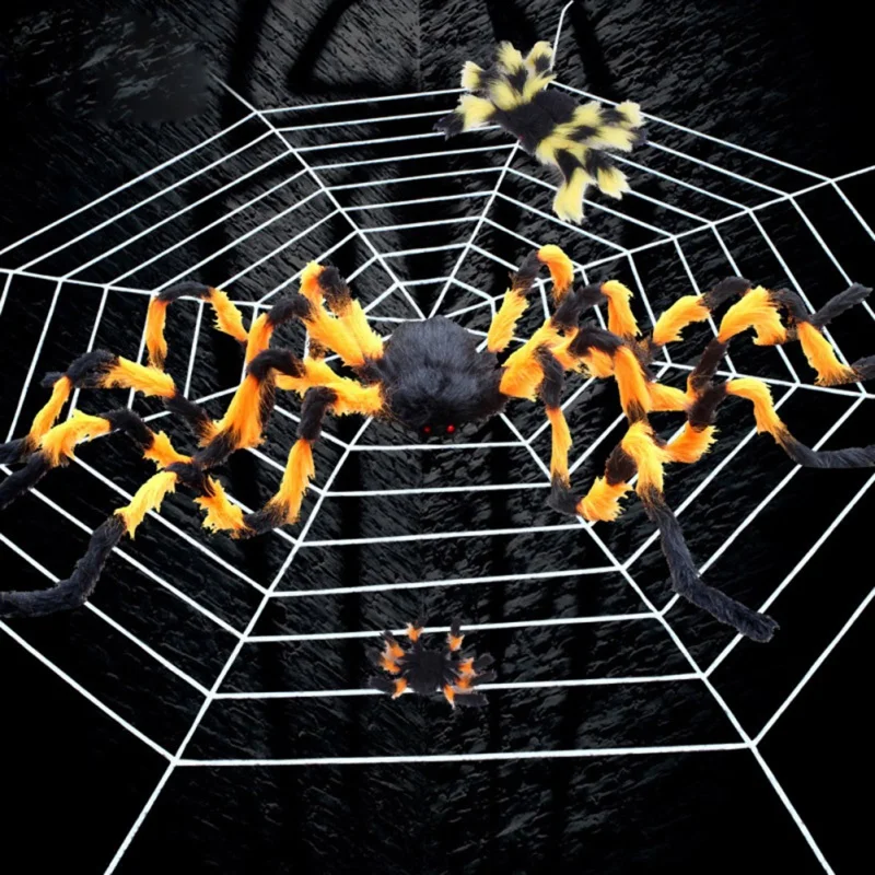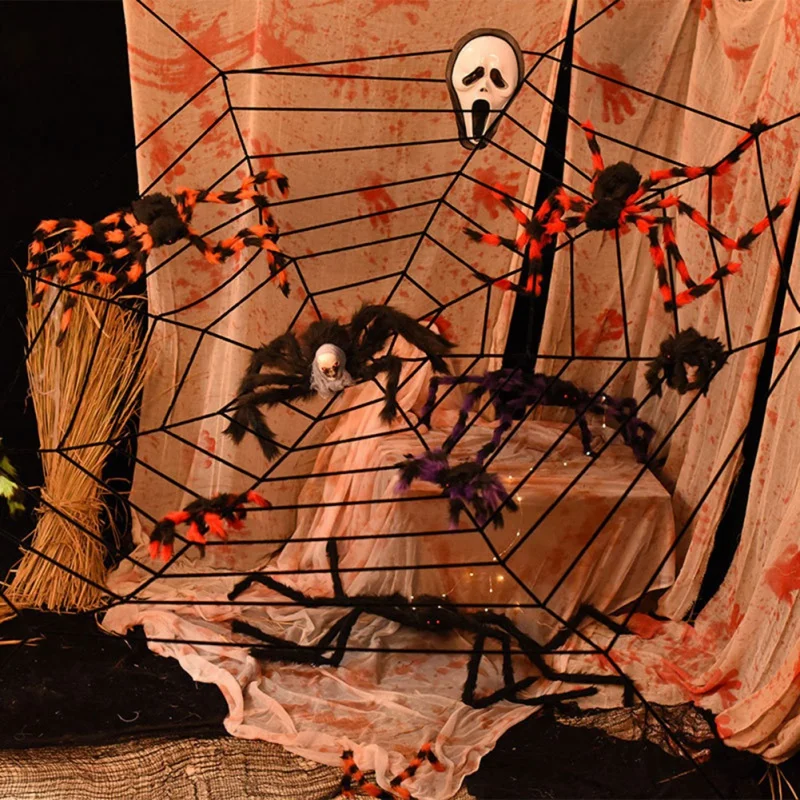 Aspecto realista, decora la fiesta de Halloween con esta tela de araña y nuestra araña de peluche. Debe ser una terrible noche de Halloween.