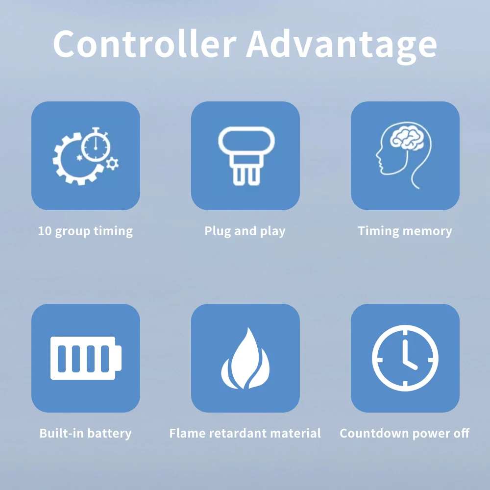 Pantalla de reloj, 10 o 18 juegos opcionales de control de potencia cronometrado ajustable, control de potencia aleatoriado, interruptor manual/automático, configuración de DST y cuenta regresiva opcional.