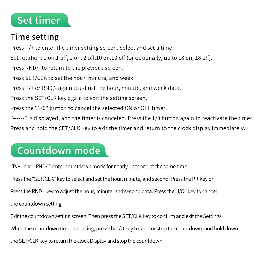 Presione la tecla "SET/CLK" para seleccionar y configurar la hora, los minutos y los segundos; presione la tecla P + o presione la tecla RND - para ajustar los datos de la hora, los minutos y los segundos.Presione la tecla "l/0" para cancelar la configuración de cuenta regresiva.