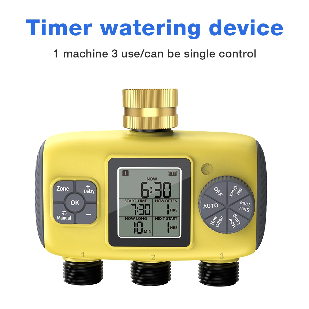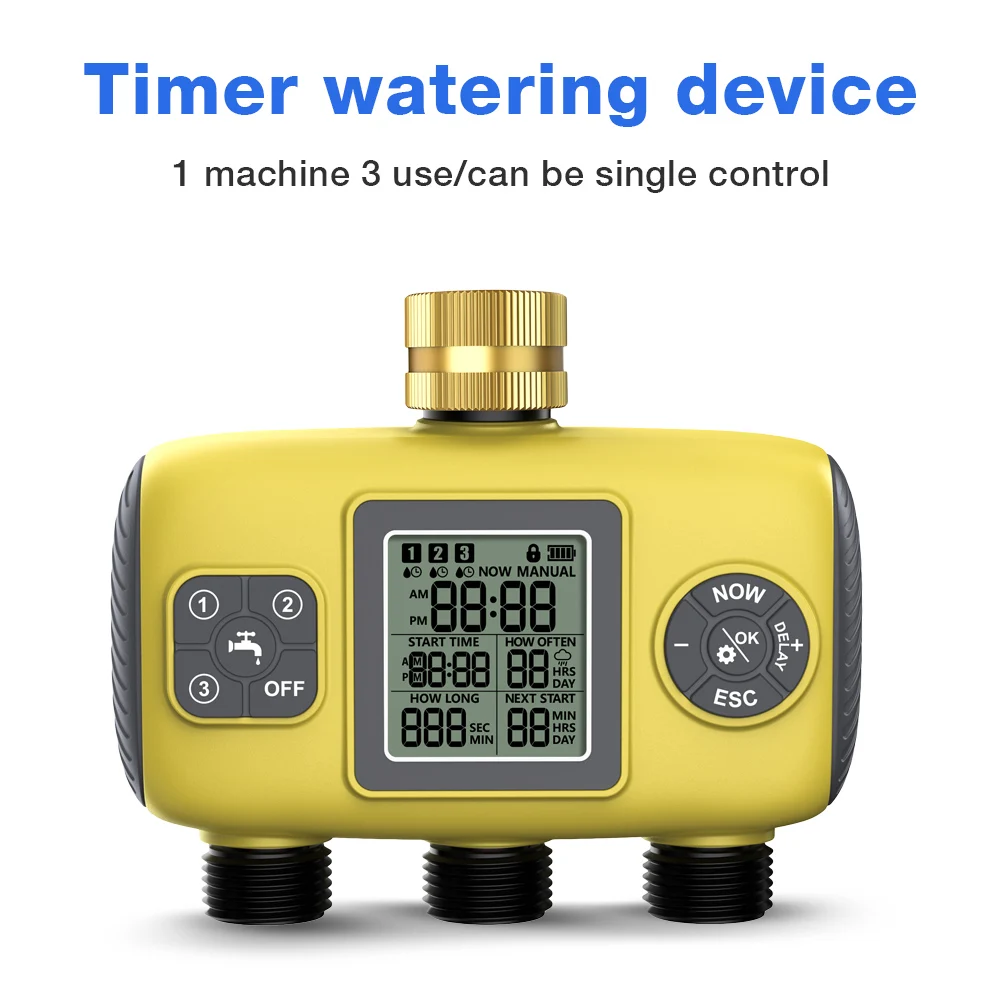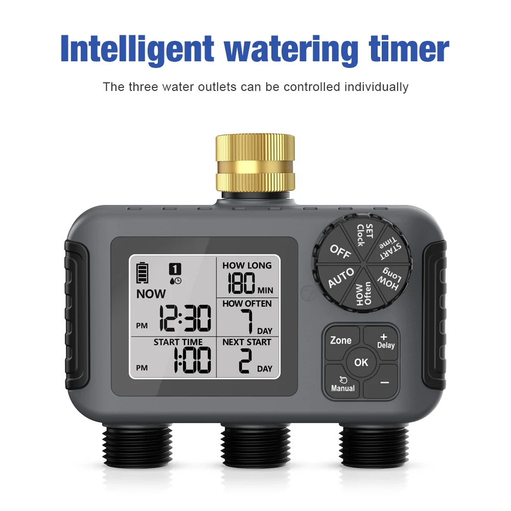 Temporizador de riego de jardín, válvula de temporizador de agua de aspersión automática de 3 salidas, temporizador de agua de riego al aire libre, Control de sincronización programable