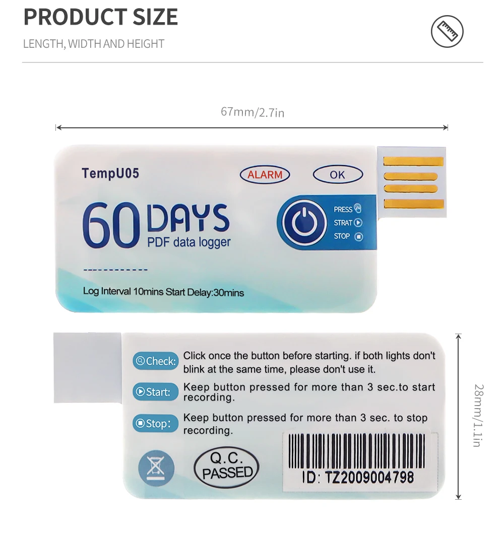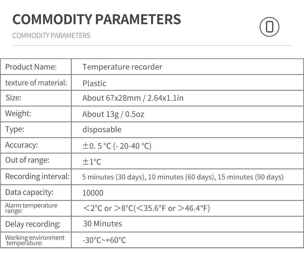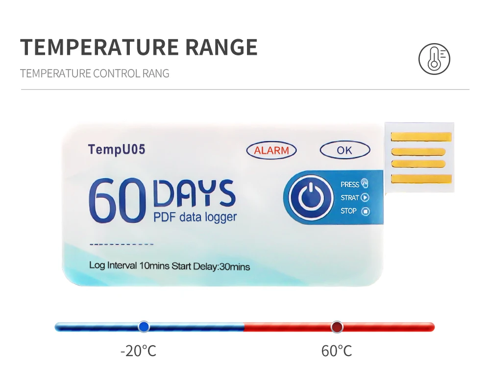 【Grabadora de temperatura de 60 90 días】Interfaz USB Temp RecorderThe puede grabar continuamente durante 60 / 90 días, tiene una capacidad de almacenamiento de 10.000 y puede exportar informes en PDF para una fácil visualización de los datos. IP67 impermeable, amplia gama de aplicaciones. Alta precisión, tamaño pequeño, fácil de transportar.