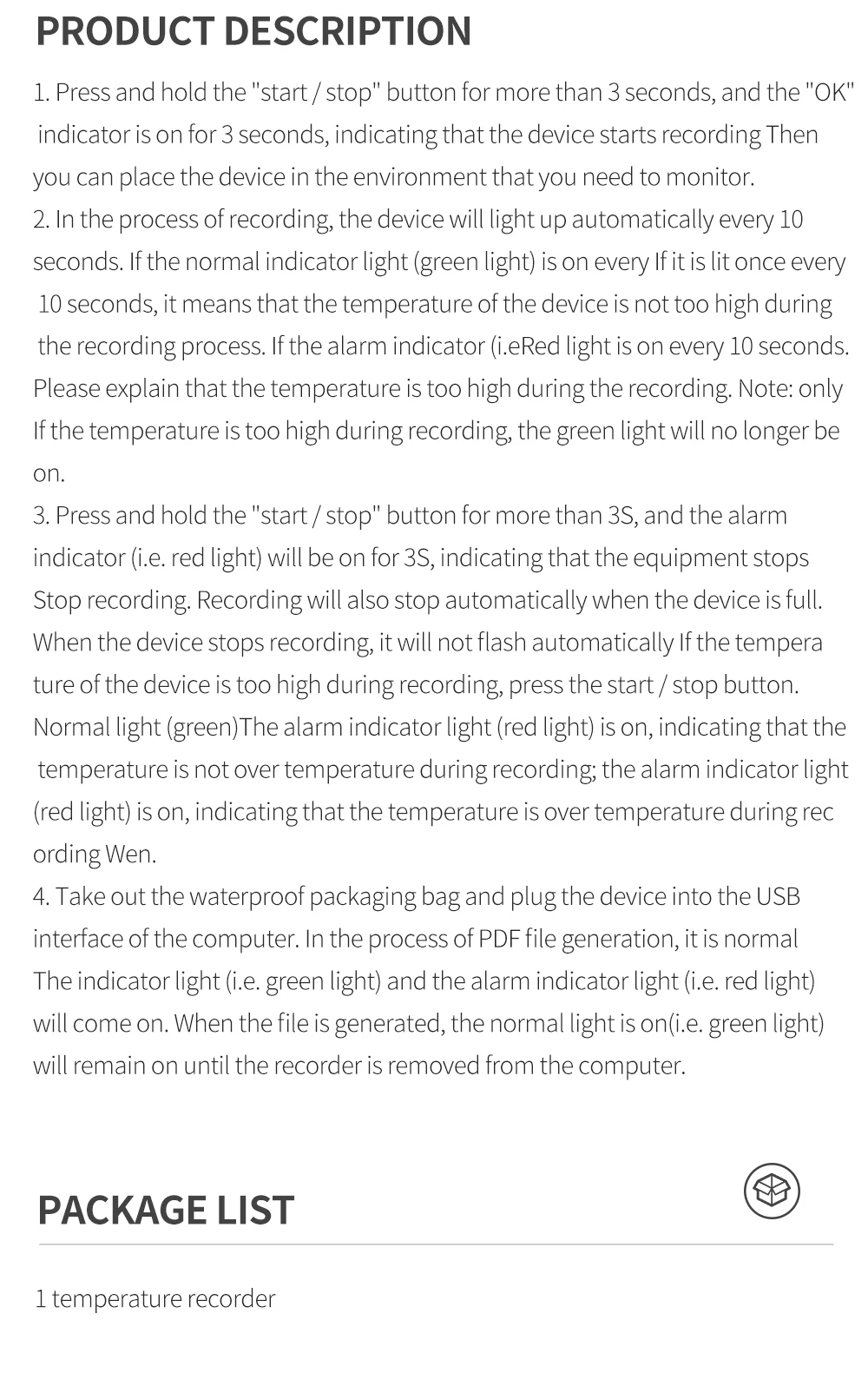 【Amplia gama de aplicaciones】Utilizado principalmente para monitorear datos de temperatura, almacenamiento y transporte de medicamentos alimentarios y productos químicos, también adecuado para almacenamiento farmacéutico, producción farmacéutica, transporte de cadena de frío, almacenamiento en frío. Refrigeración de alimentos, plantación de invernadero