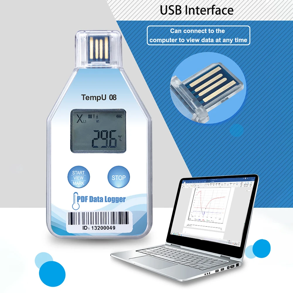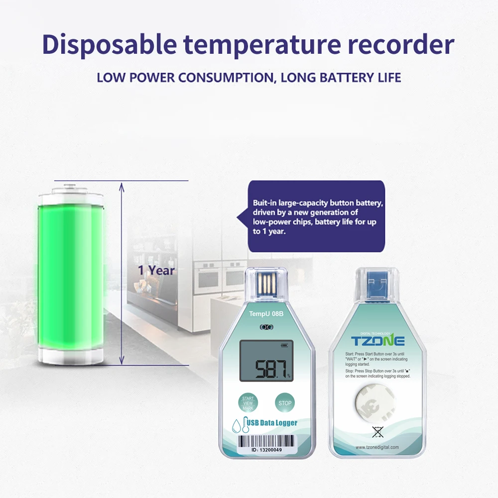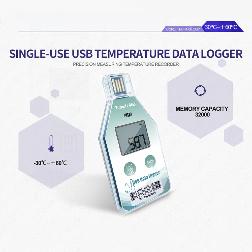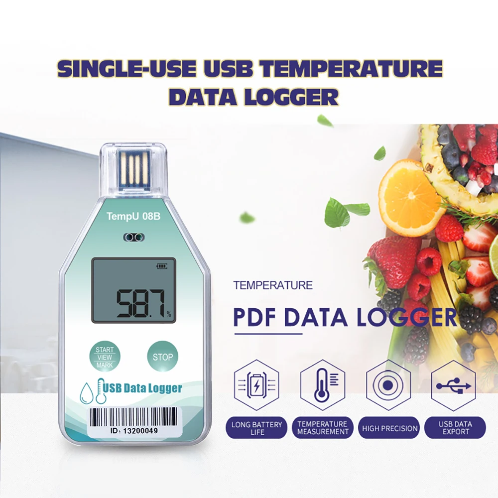Registrador de temperatura y humedad desechable TempU08B ----- Grabación de temperatura y humedad digital Lcd profesional, temperatura y humedad fáciles de probar después de un arranque con una tecla o arranque con temporizador, puede grabar 32000 conjuntos de datos, A través de la interfaz USB, después de enchufar el informe se puede generar fácil y automáticamente, No es necesario instalar ningún controlador después de enchufarlo al ordenador. Se utiliza principalmente para registrar los datos de temperatura de controlar y alimentos, medicamentos, productos químicos, etc. Durante el almacenamiento y el transporte. Es ampliamente utilizado en todos los aspectos de almacenamiento, logística y cadena de frío, como contenedores refrigerados, camiones refrigerados, bolsas refrigeradas, almacenamiento en frío, laboratorios, etc.