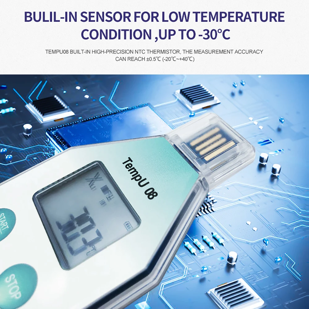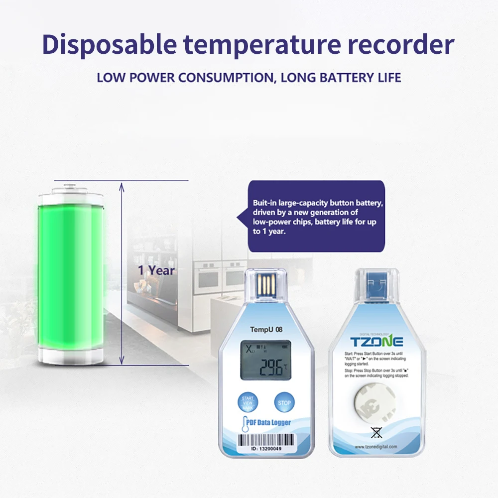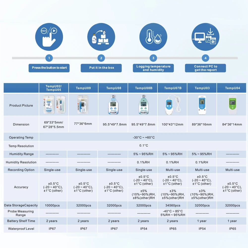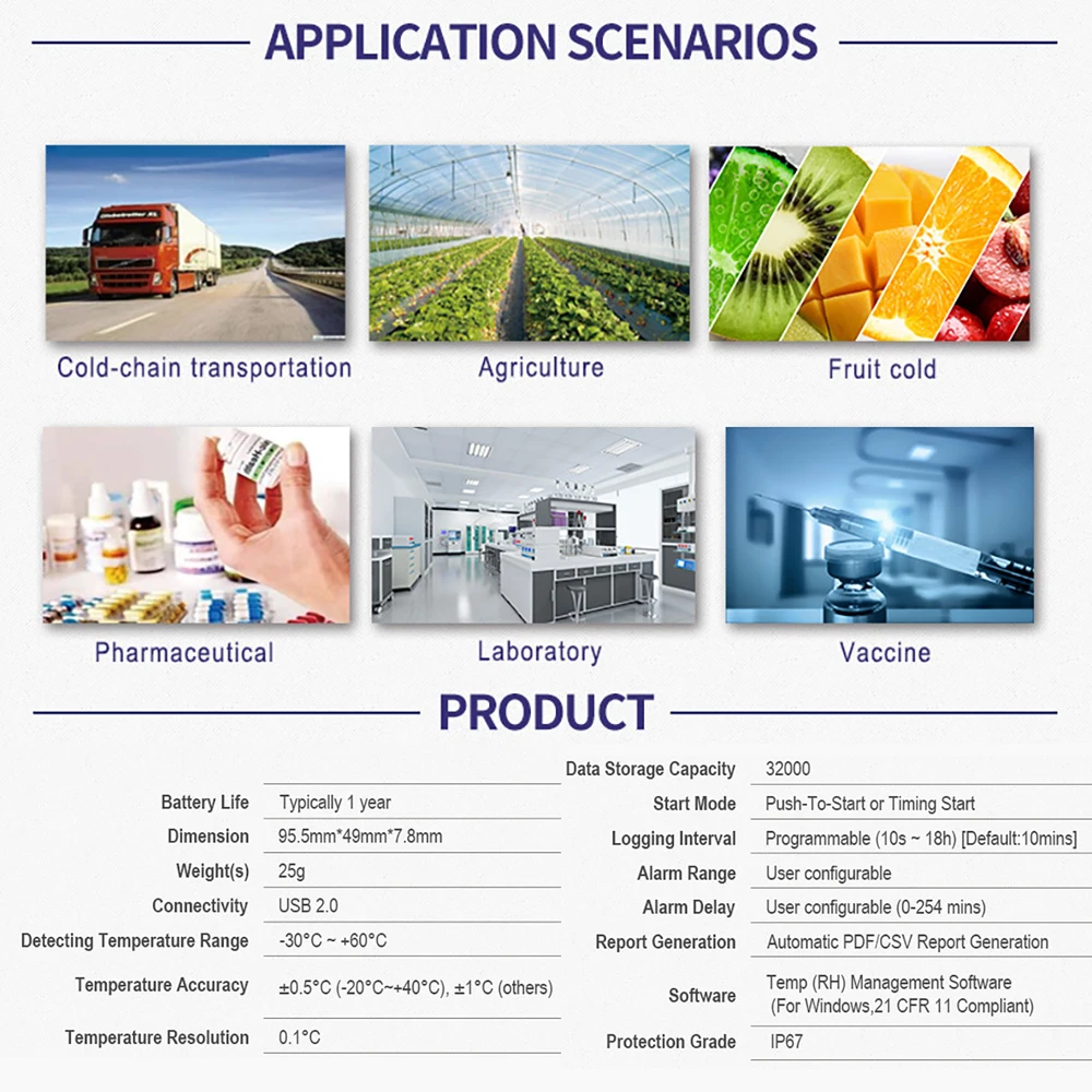 Registrador de temperatura y humedad desechable TempU08B ----- Grabación de temperatura y humedad digital Lcd profesional, temperatura y humedad fáciles de probar después de un arranque con una tecla o arranque con temporizador, puede grabar 32000 conjuntos de datos, A través de la interfaz USB, después de enchufar el informe se puede generar fácil y automáticamente, No es necesario instalar ningún controlador después de enchufarlo al ordenador. Se utiliza principalmente para registrar los datos de temperatura de controlar y alimentos, medicamentos, productos químicos, etc. Durante el almacenamiento y el transporte. Es ampliamente utilizado en todos los aspectos de almacenamiento, logística y cadena de frío, como contenedores refrigerados, camiones refrigerados, bolsas refrigeradas, almacenamiento en frío, laboratorios, etc.