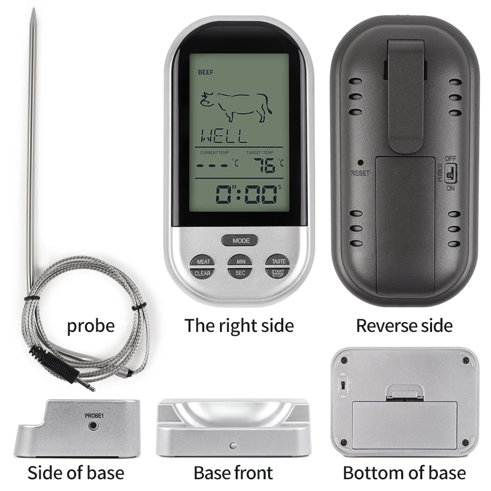 1. 【Monitor remoto inalámbrico】 Este termómetro inalámbrico para carne con receptor y transmisor le permite controlar la carne y la temperatura de la parrilla/horno/ahumador desde 30 m de distancia.No es necesario estar cerca todo el tiempo, haga libremente lo que quiera hacer mientras cocina. El termómetro para parrilla es fácil de usar y de limpiar.