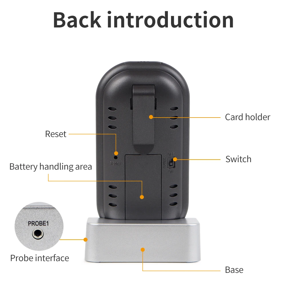 3. 【Función de temporizador y termómetro】 El termómetro digital inalámbrico para barbacoa permite configurar las temperaturas y el temporizador usted mismo.Temporizador con función de cuenta atrás y cuenta atrás.Establezca el tiempo para probar los alimentos en el modo Temporizador o cuando la temperatura de prueba alcance la temperatura objetivo, el flash de los pitidos le avisará para evitar cocinar demasiado/poco cocido, puede vigilar sus alimentos en cualquier momento.