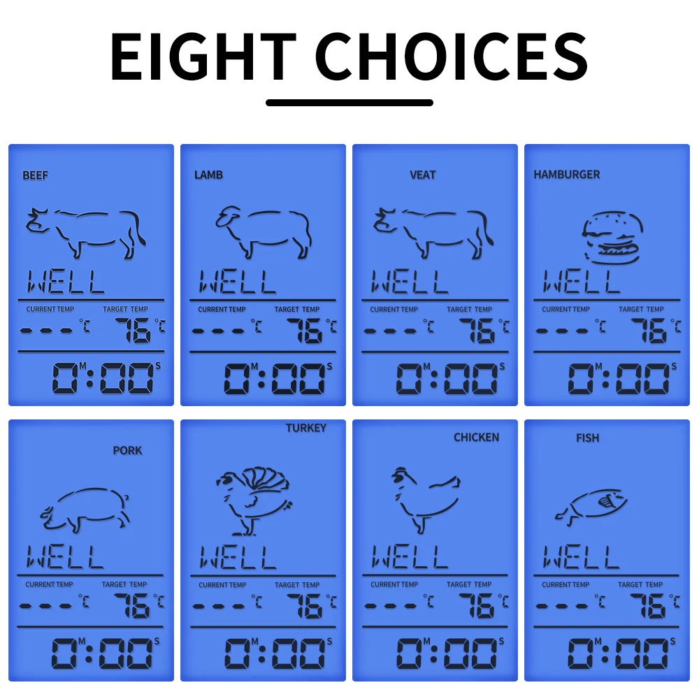 2.【8 tipos de carne y 5 modos de sabor】Termómetro para barbacoa con temperaturas preestablecidas para 8 tipos de carne (velo, hamburguesa, cerdo, pavo, pollo, pescado, ternera, cordero) y 5 niveles de sabores (Bien hecho, Medio, Medio, Raro y Raro).La gran pantalla LCD muestra tanto la temperatura actual como la objetivo para un funcionamiento intuitivo.Retroiluminación para uso en condiciones de poca luz.