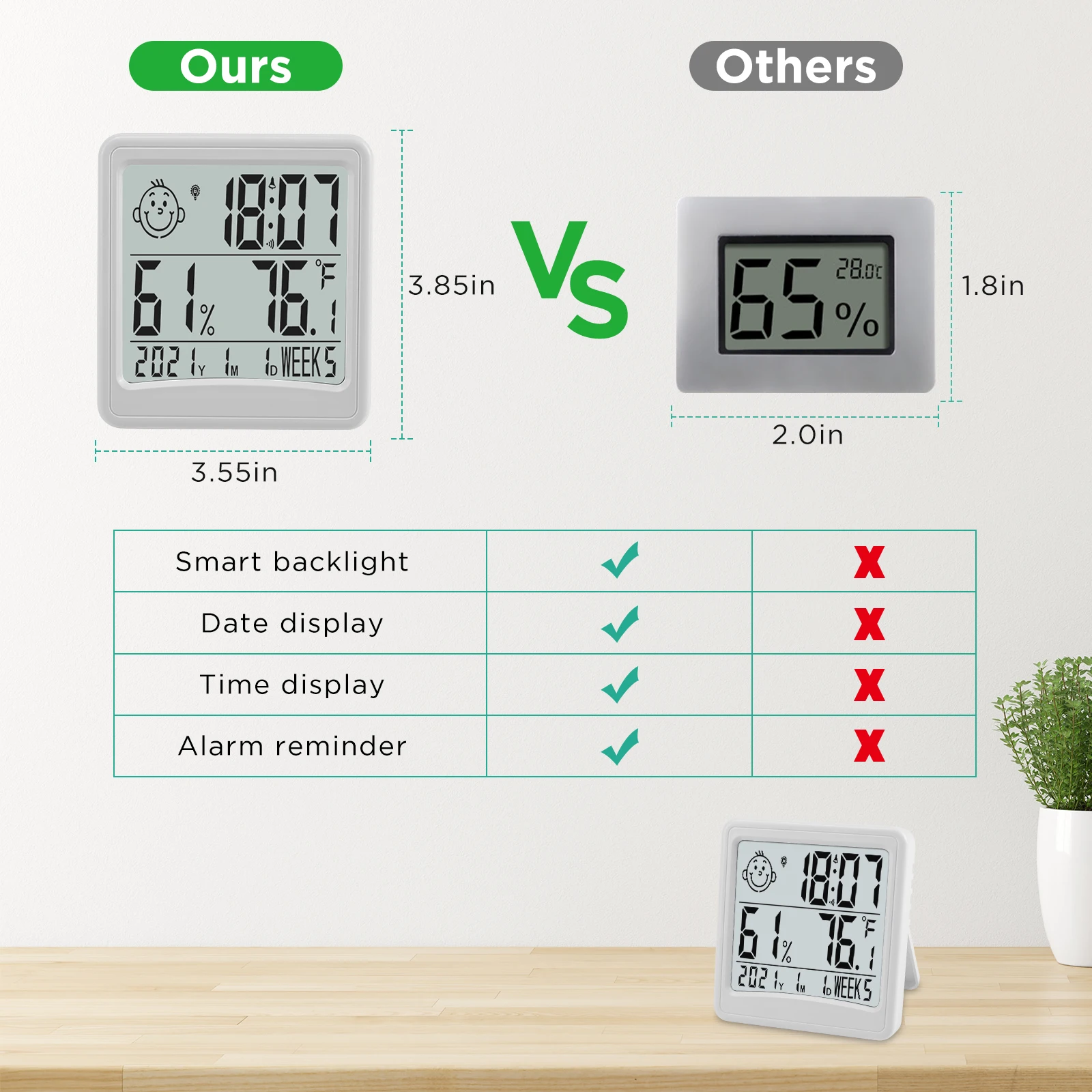 【Múltiples opciones de montaje 】El Monitor de temperatura y humedad adopta un diseño de escritorio y montado en la pared y está equipado con instalación de pasta, adecuado para varios tipos de habitaciones. Se puede colocar en la sala de estar, habitación de bebé, cocina, sótano, oficina, invernadero, sala de guitarras, jardín y bodega