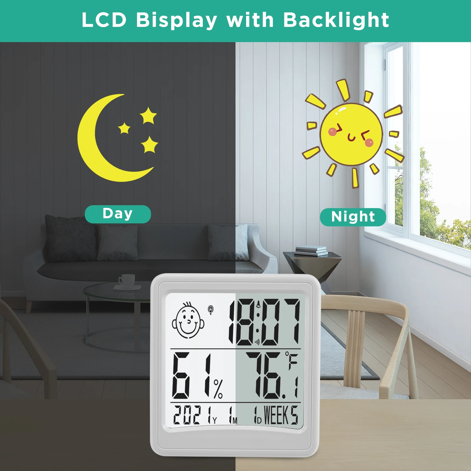 【Pantalla LCD retroiluminada】Termómetro para interiores Equipado con una pantalla LCD retroiluminada de 4 pulgadas, puede encender la luz de fondo tocando la parte superior, puede entender la temperatura y el higrómetro de un vistazo incluso en condiciones de poca luz (10 segundos de apagado automático).