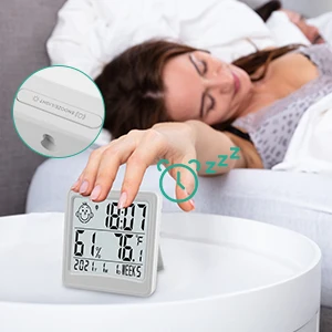 【Mejora el diseño inteligente】 El termómetro digital adopta números en negrita de pantalla grande para una fácil lectura, termómetro/higrómetro/fecha/hora/alarma/informe puntual de diseño multifuncional mejorado, el selector °F/°C le da la vida personalizada que desea