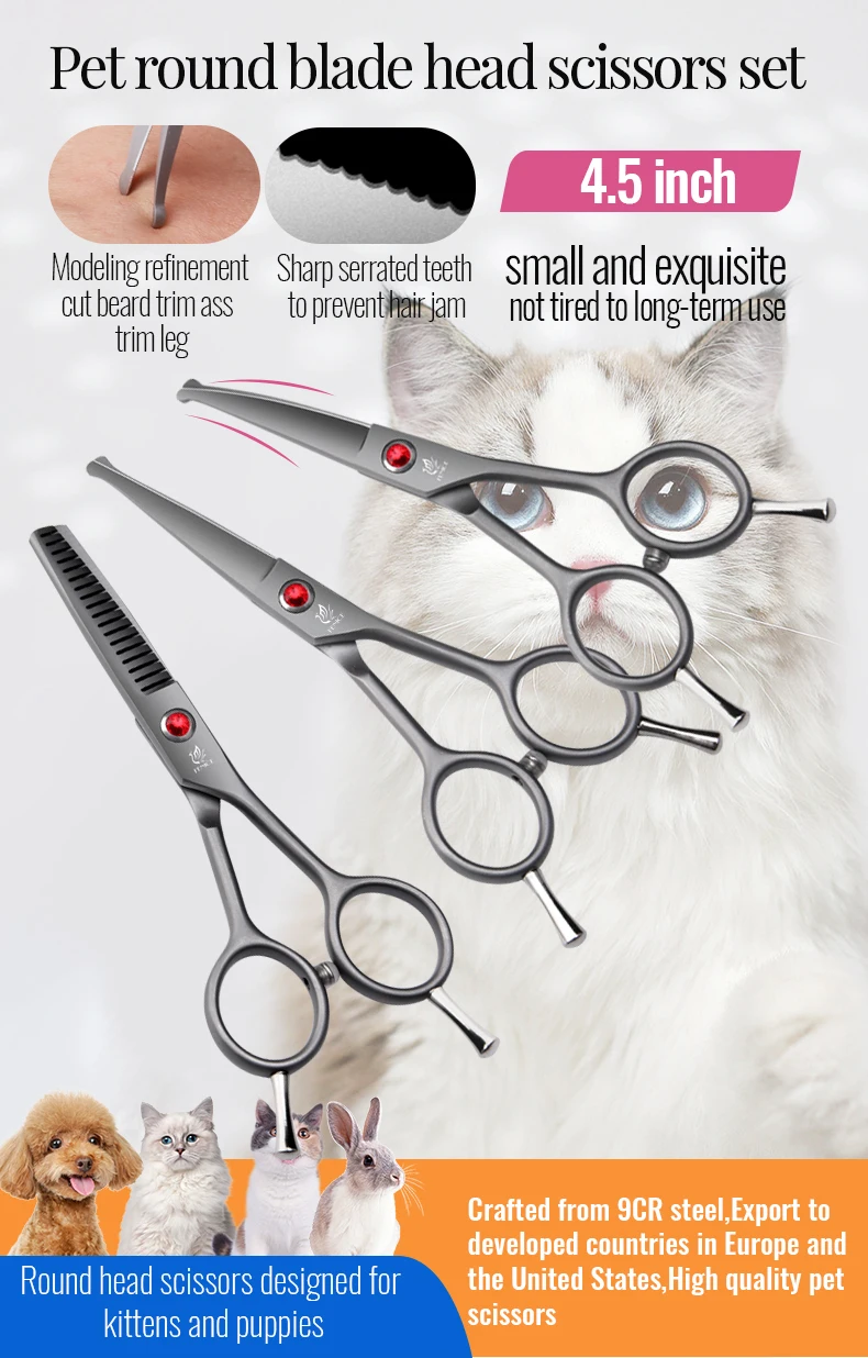 Las Tijeras Fenice de punta redonda para mascotas son un accesorio de aseo profesional de 4,5 pulgadas diseñado específicamente para trabajar en zonas delicadas como la cara, las orejas y la nariz de perros y gatos. Su diseño prioriza la seguridad y la precisión durante el recorte.