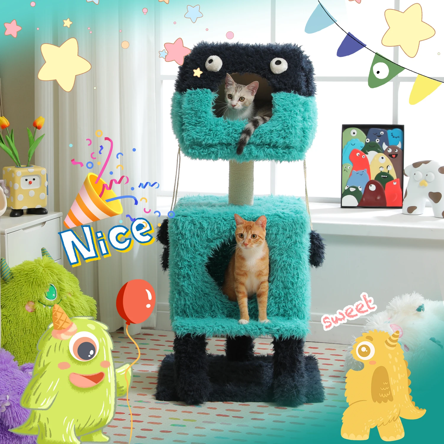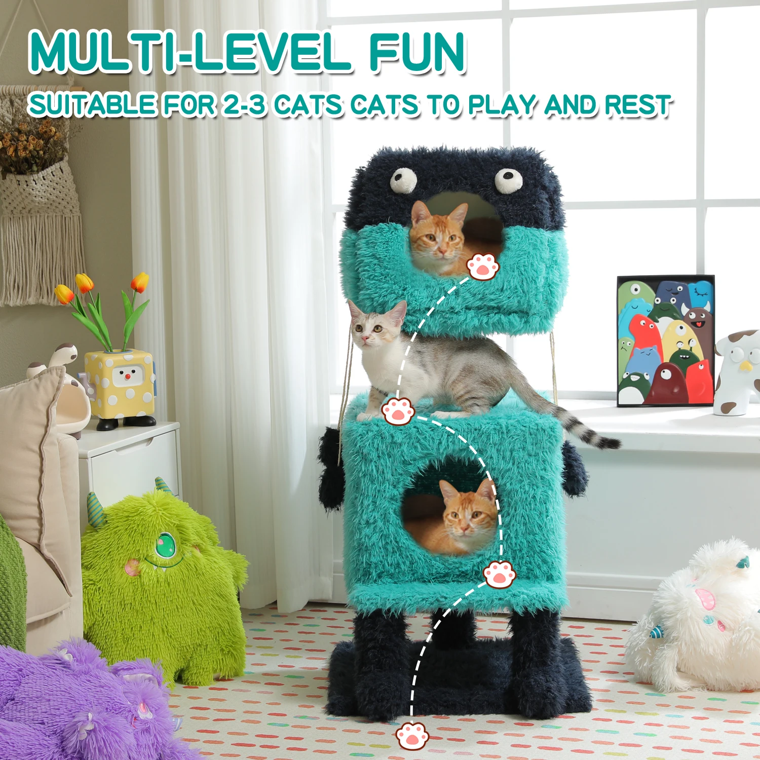 Monster Series Cute Cat Tree Tower Modelado de felpa con 2 Big Cat Condos Poste para rascar gatos con zapatos de felpa Trenzas extrañas Juguete