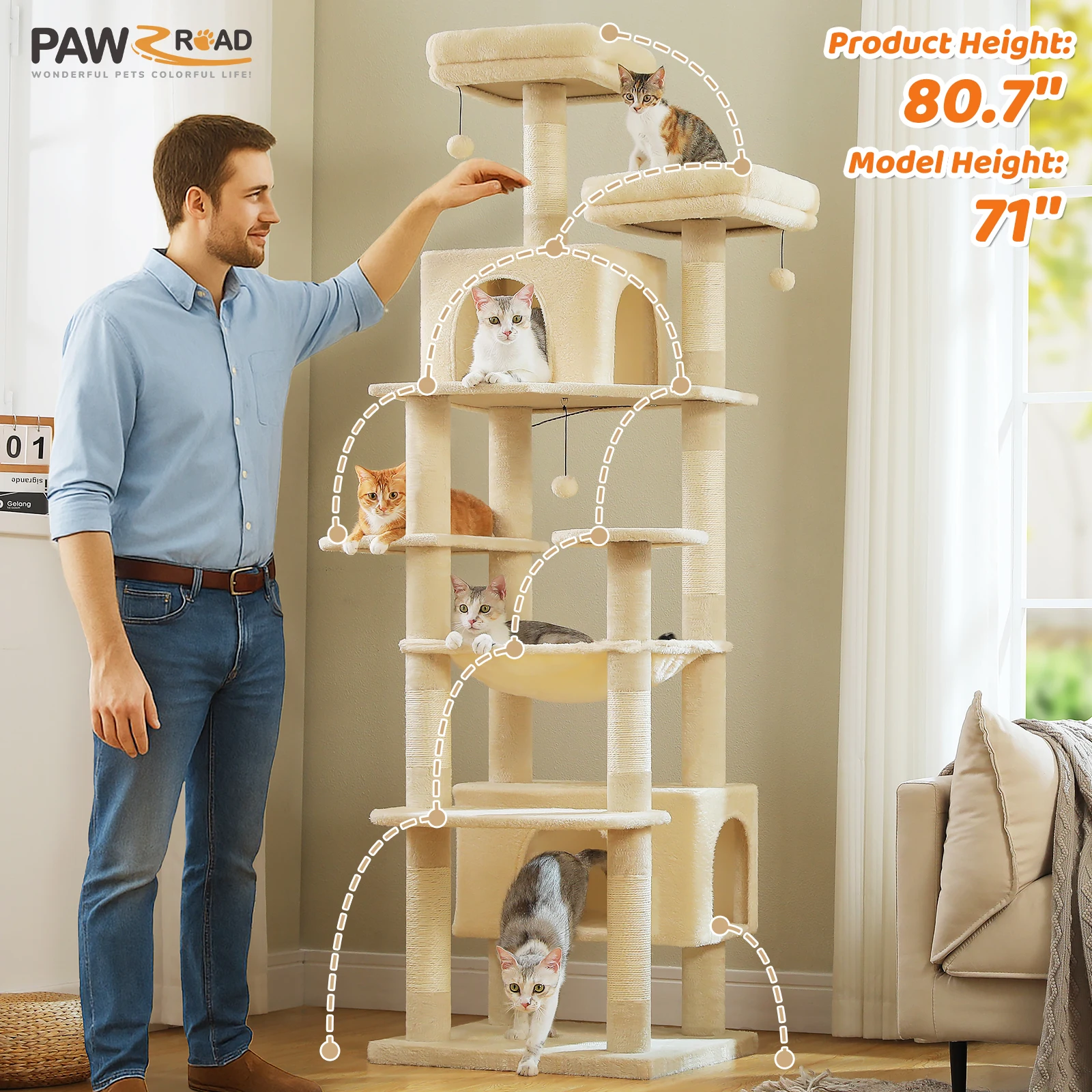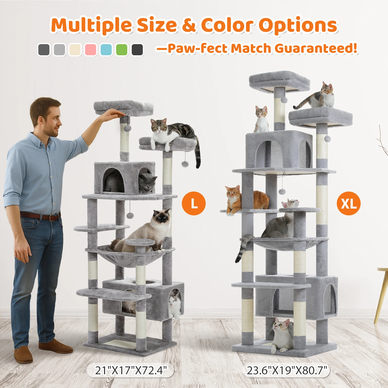 Tamaño XXL de 205 cm de altura: Con una altura total de 205 cm en una estructura de 8 niveles, nuestro árbol para gatos extragrande ofrece un amplio espacio para que los gatos se relajen, jueguen y tomen una siesta sin sentirse apretados, perfecto para acomodar entre 4 y 6 gatos enérgicos.El espacio entre cada nivel se amplía significativamente, lo que hace que subir y bajar sea más suave que nunca con plataformas diseñadas.