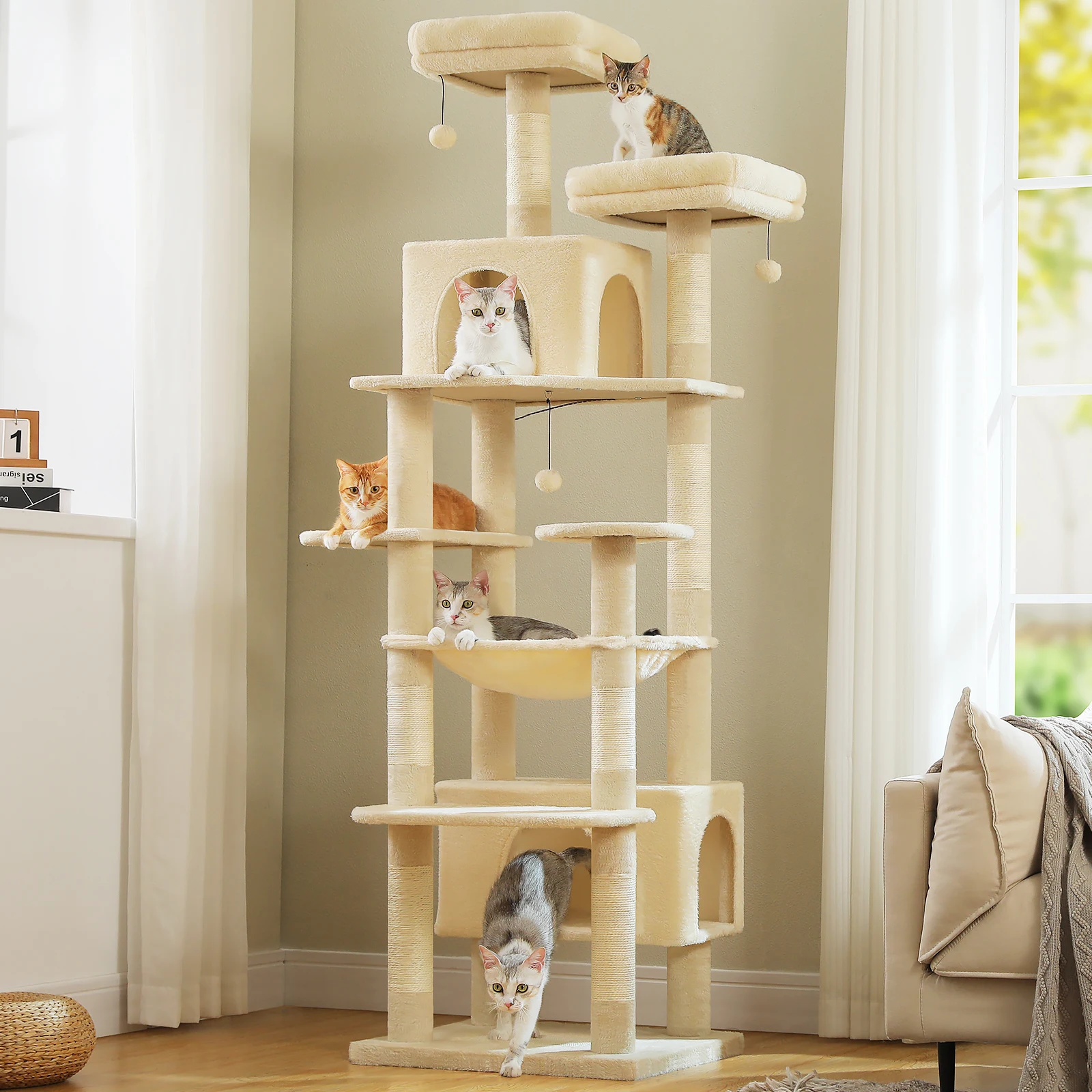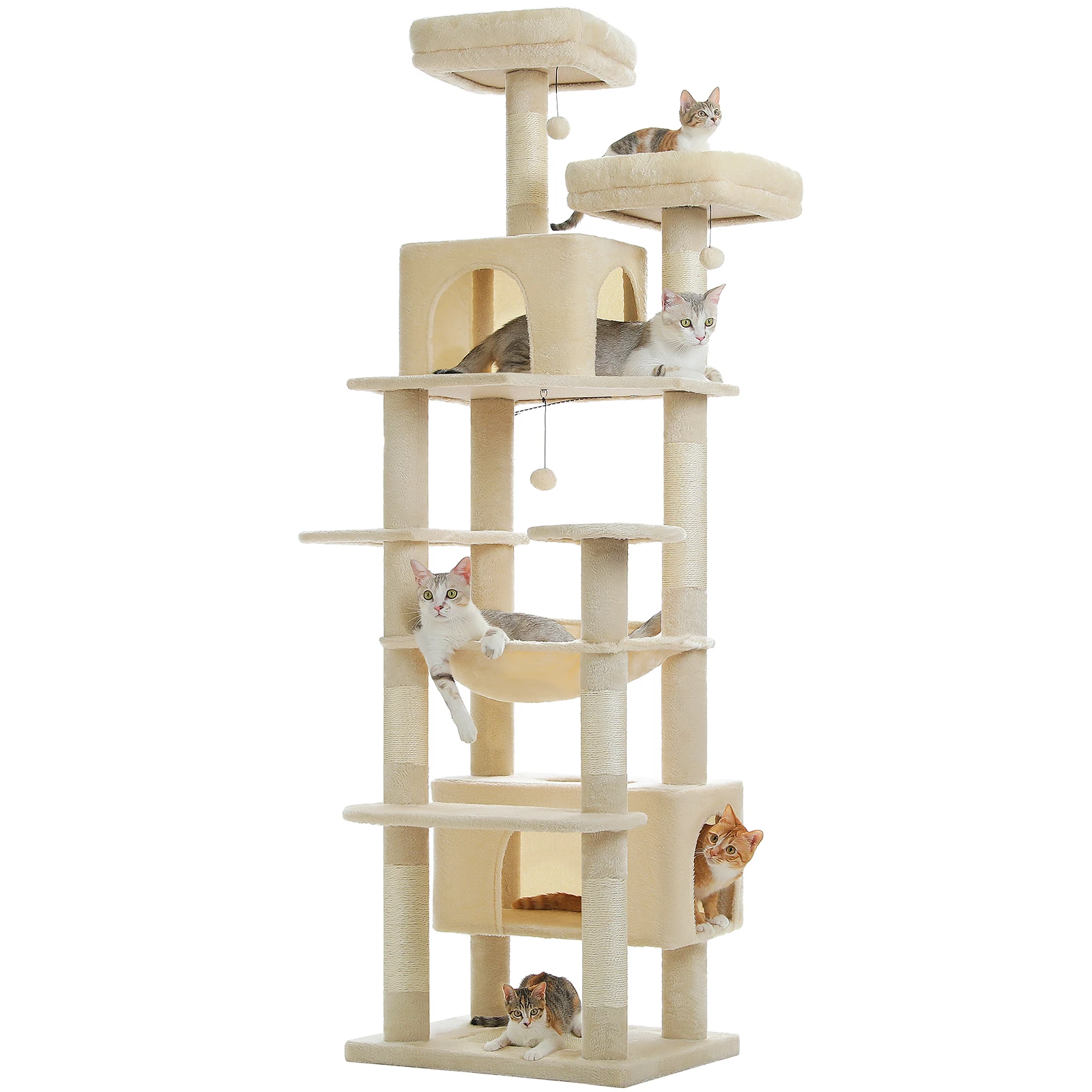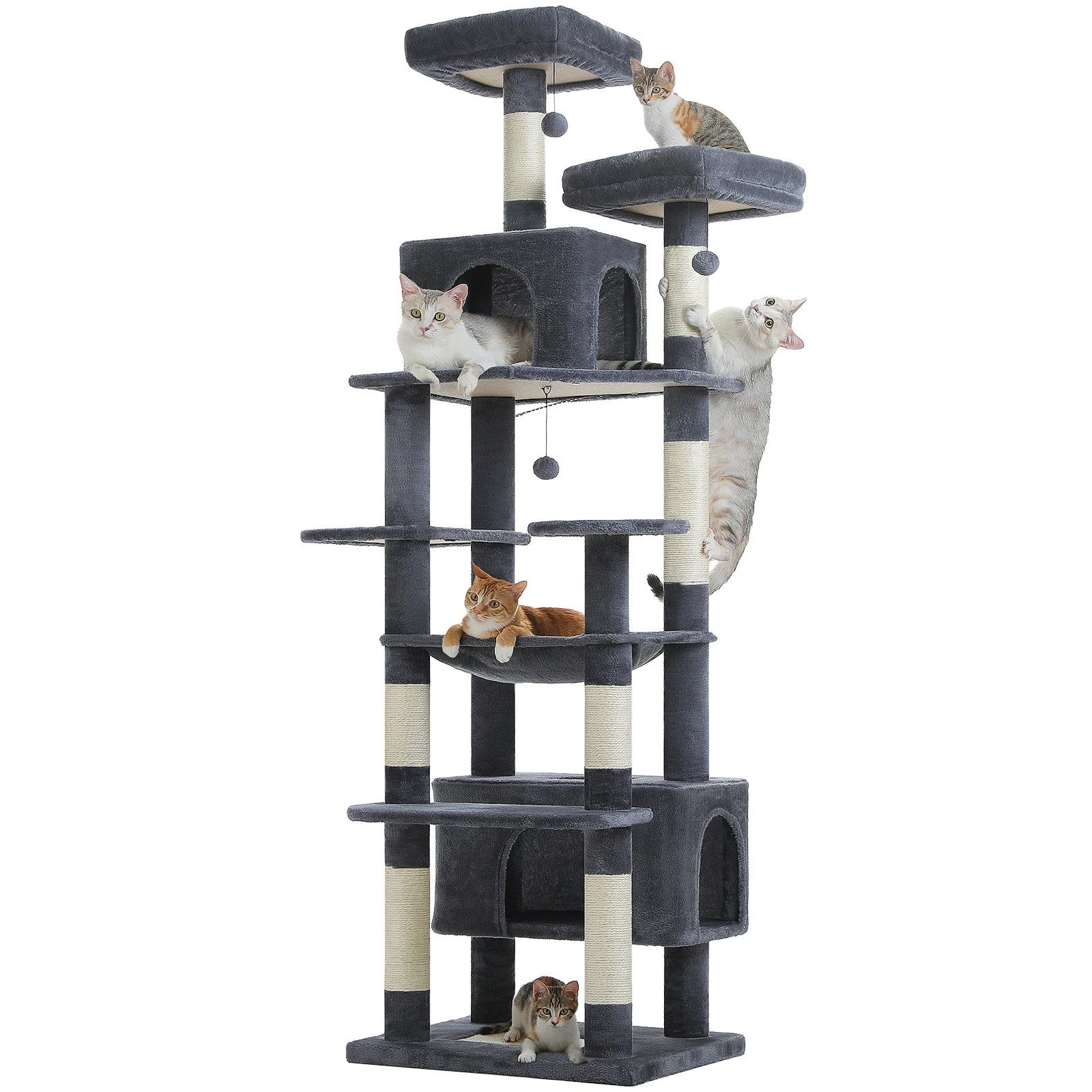Arranhões anchos y vertical únicos: A los gatos les encanta rascarse.Esta torre alta para gatos tiene una almohadilla para rascar única en la parte inferior, que proporciona un área más horizontal para afilar las uñas de los gatos.Además, con 7 postes reforzados envueltos con sisal natural en varios niveles, ¡pueden rayar su contenido y mantenerse alejados de muebles caros!