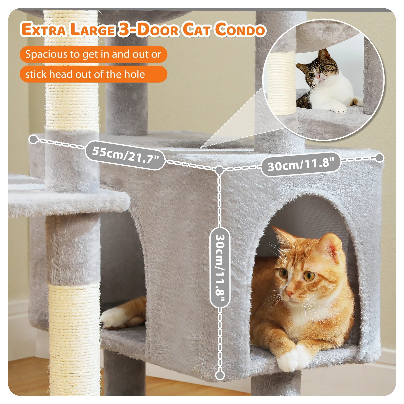 2 cuevas grandes para gatos:Esta torre para gatos cuenta con 2 nidos espaciosos diseñados para el deleite felino.El condominio largo inferior con 3 aberturas podría satisfacer perfectamente las necesidades de dormir, estirarse y jugar al escondite. El condominio de alto nivel permite a los gatos observar el entorno.