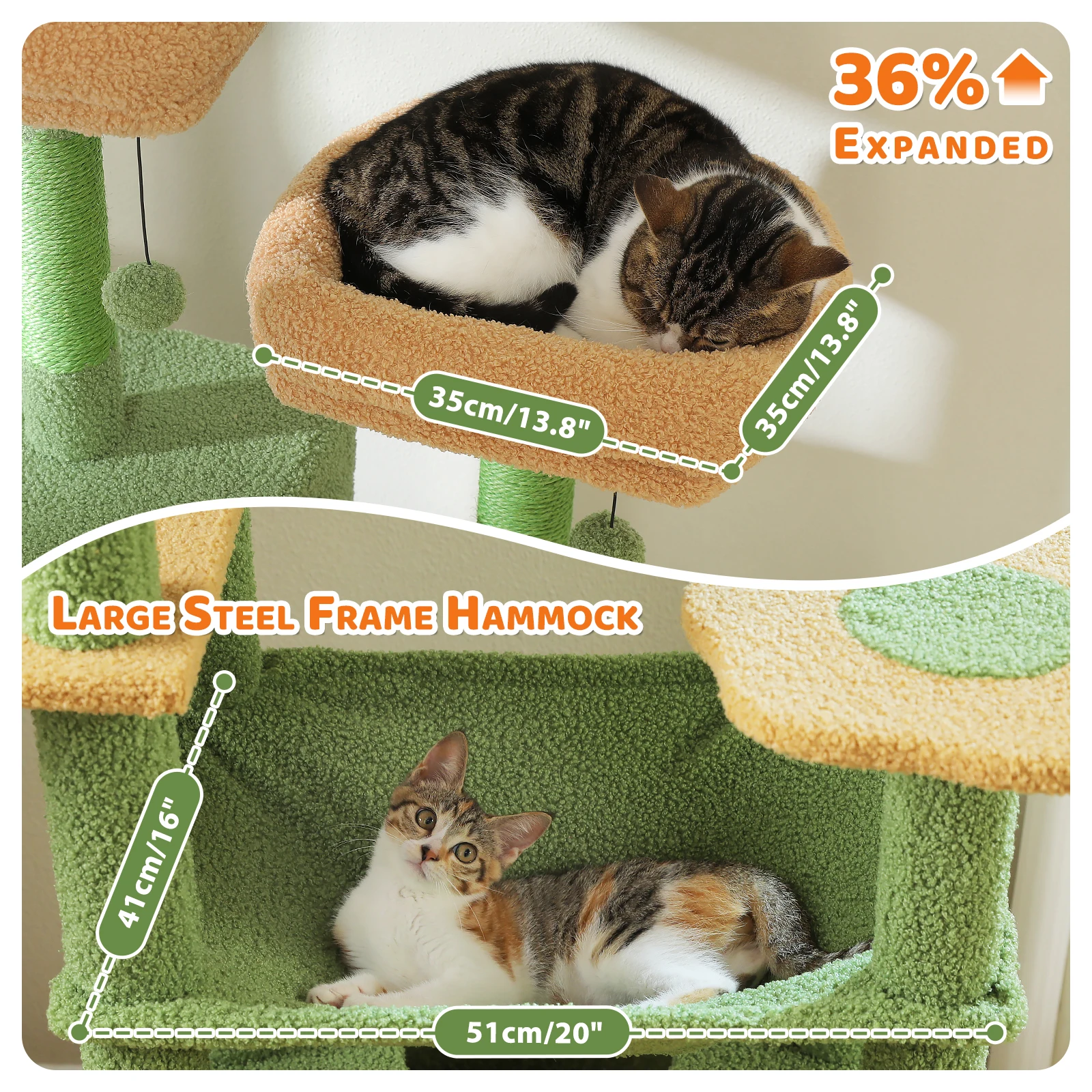 Hamaca y perchas de gran tamaño: Con una hamaca súper grande, es lo suficientemente estable y ancha como para soportar a tus 2 amigos peludos grasos con hierba gatera.2 perchas dignas de color verde a una altura elevada de 205 cm son adecuadas para que sus gatos se relajen mientras miran su dominio y miran al aire libre.