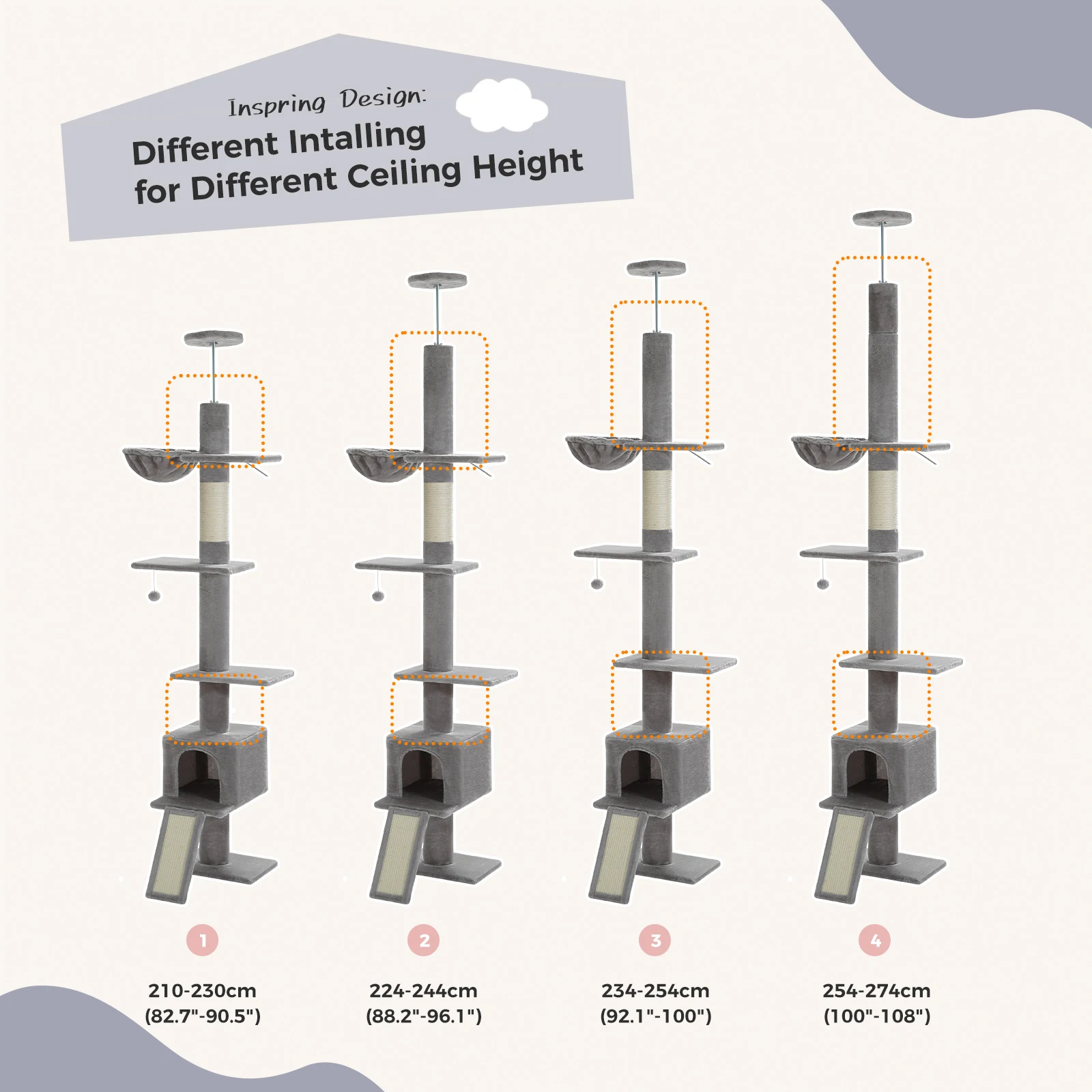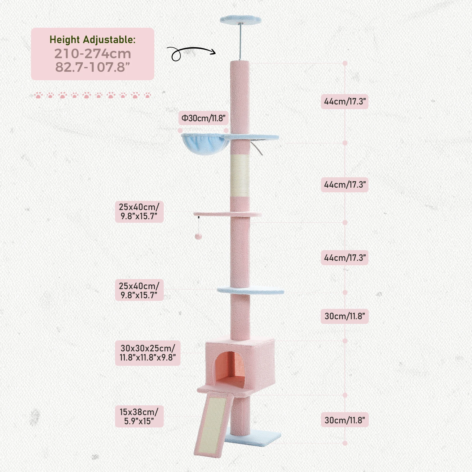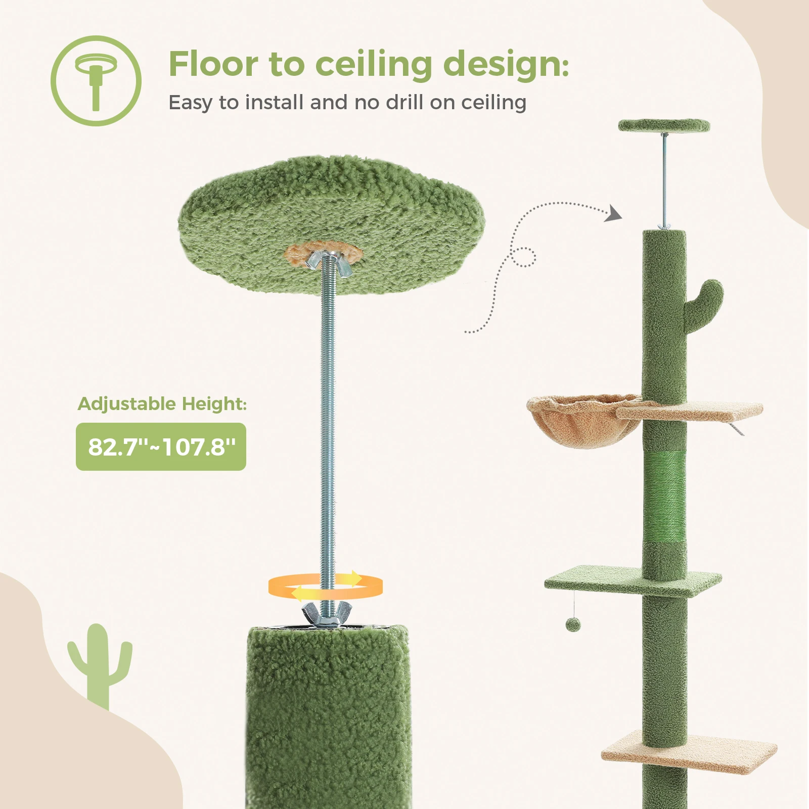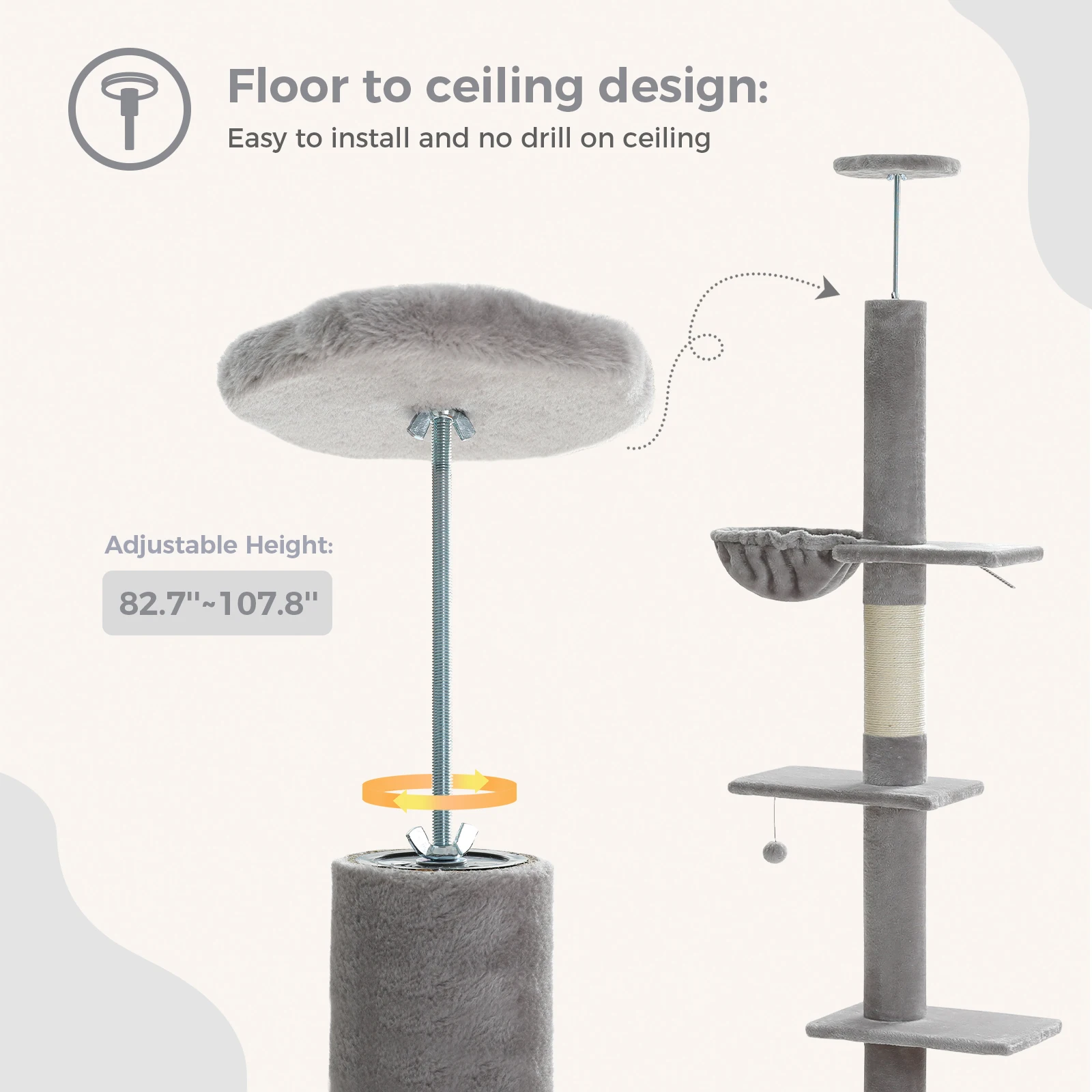 1. Árbol para gatos ajustable: el árbol para gatos del piso al techo está diseñado para adaptarse a cualquier espacio con su función de altura ajustable de 210 CM ~ 274 CM], que proporciona un árbol para gatos alto que no consume mucha área del piso.Puedes elegir diferentes formas de montar el árbol trepador para gatos siguiendo las instrucciones para que encaje perfectamente con tu techo.