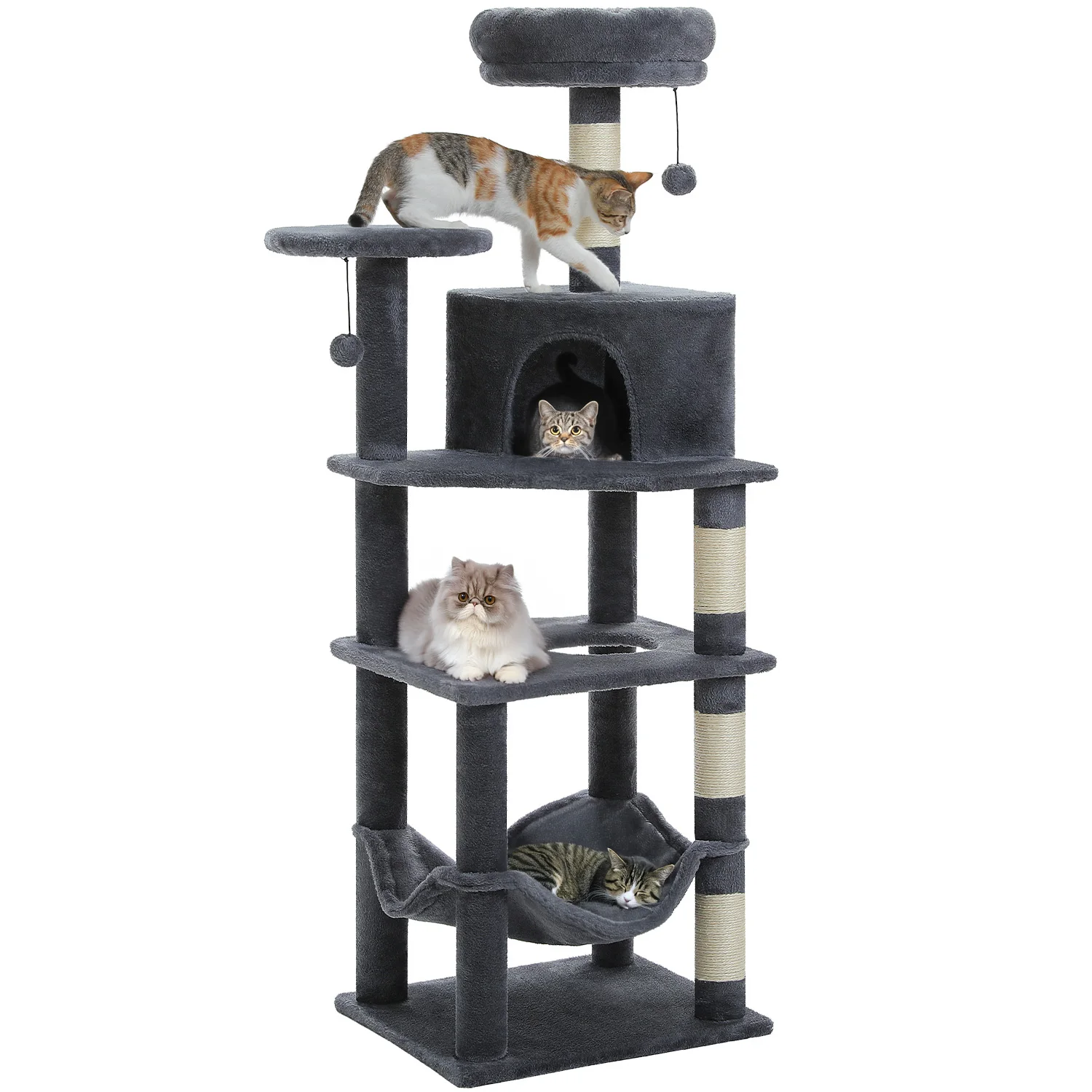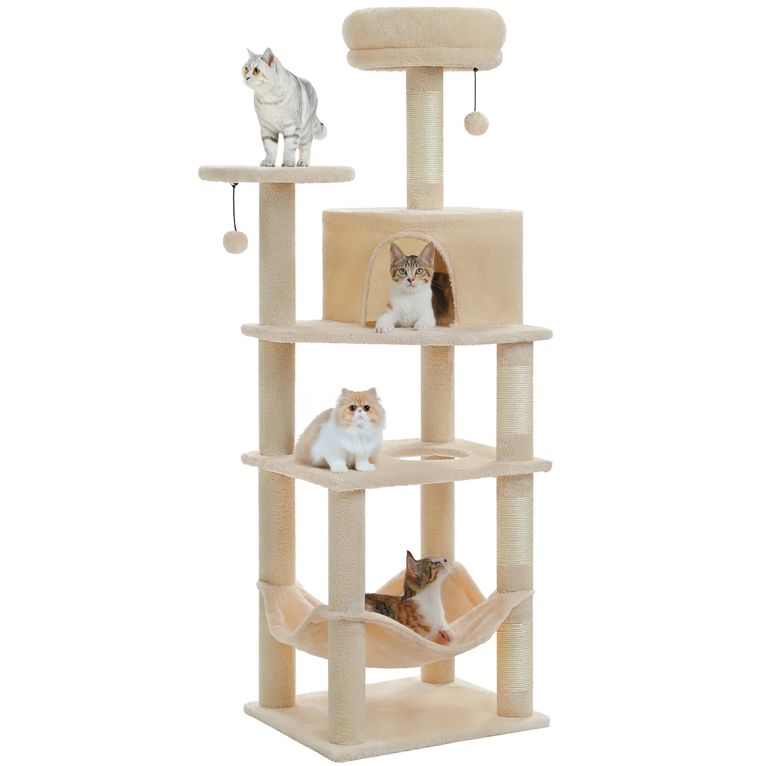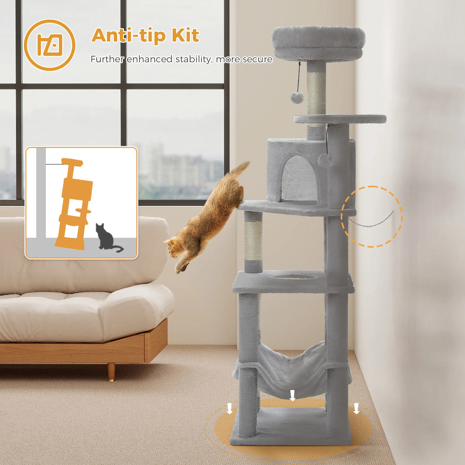 Torre de árbol para gatos de 6 niveles con hamaca súper grande, condominio espacioso, kit antivuelco, 2 bolas colgantes, 4 postes rascadores de sisal natural