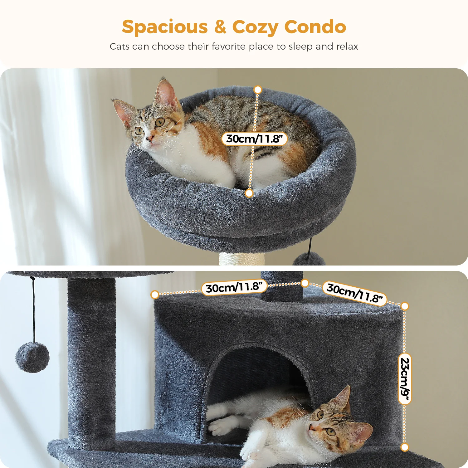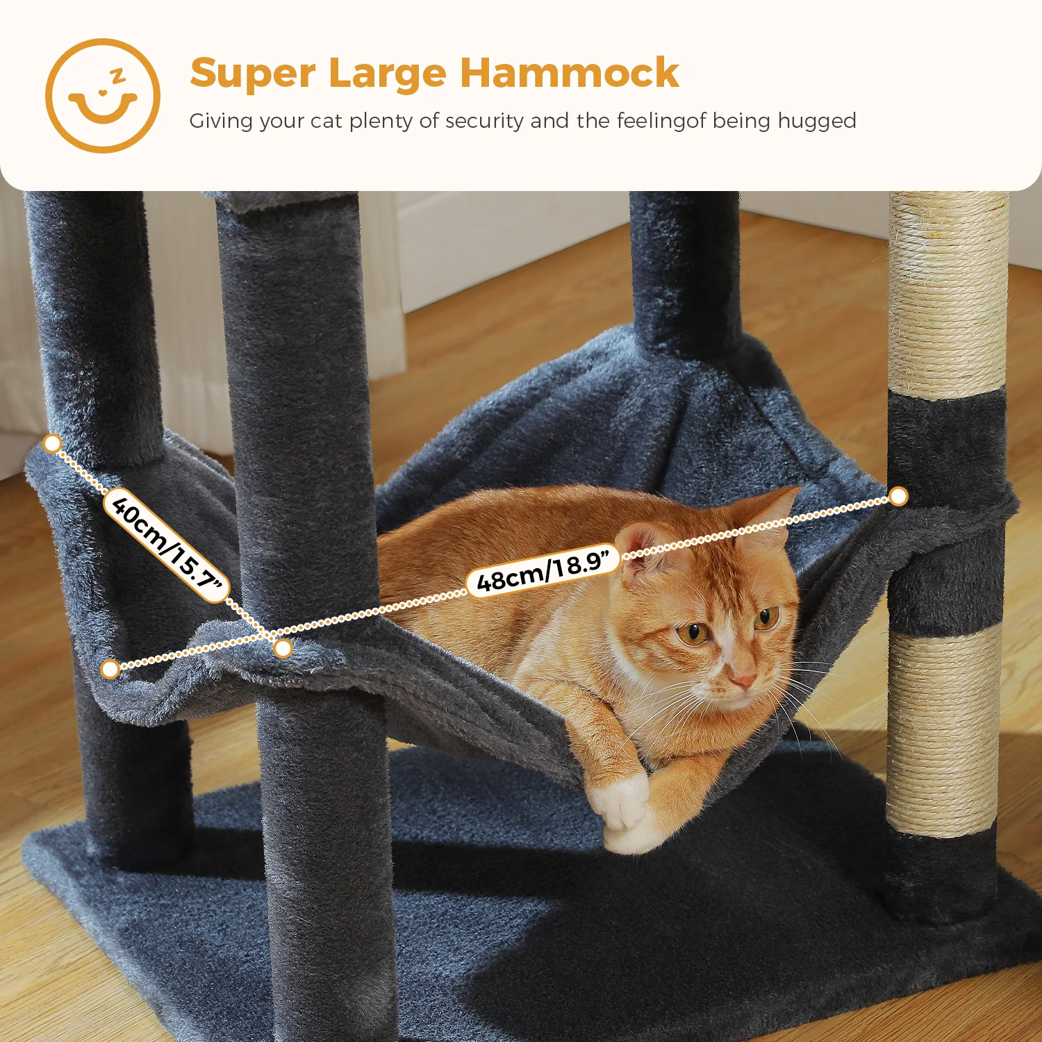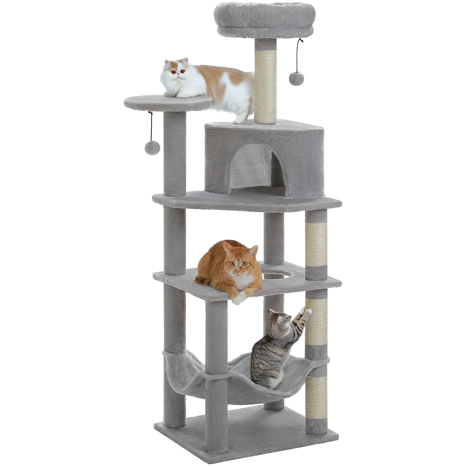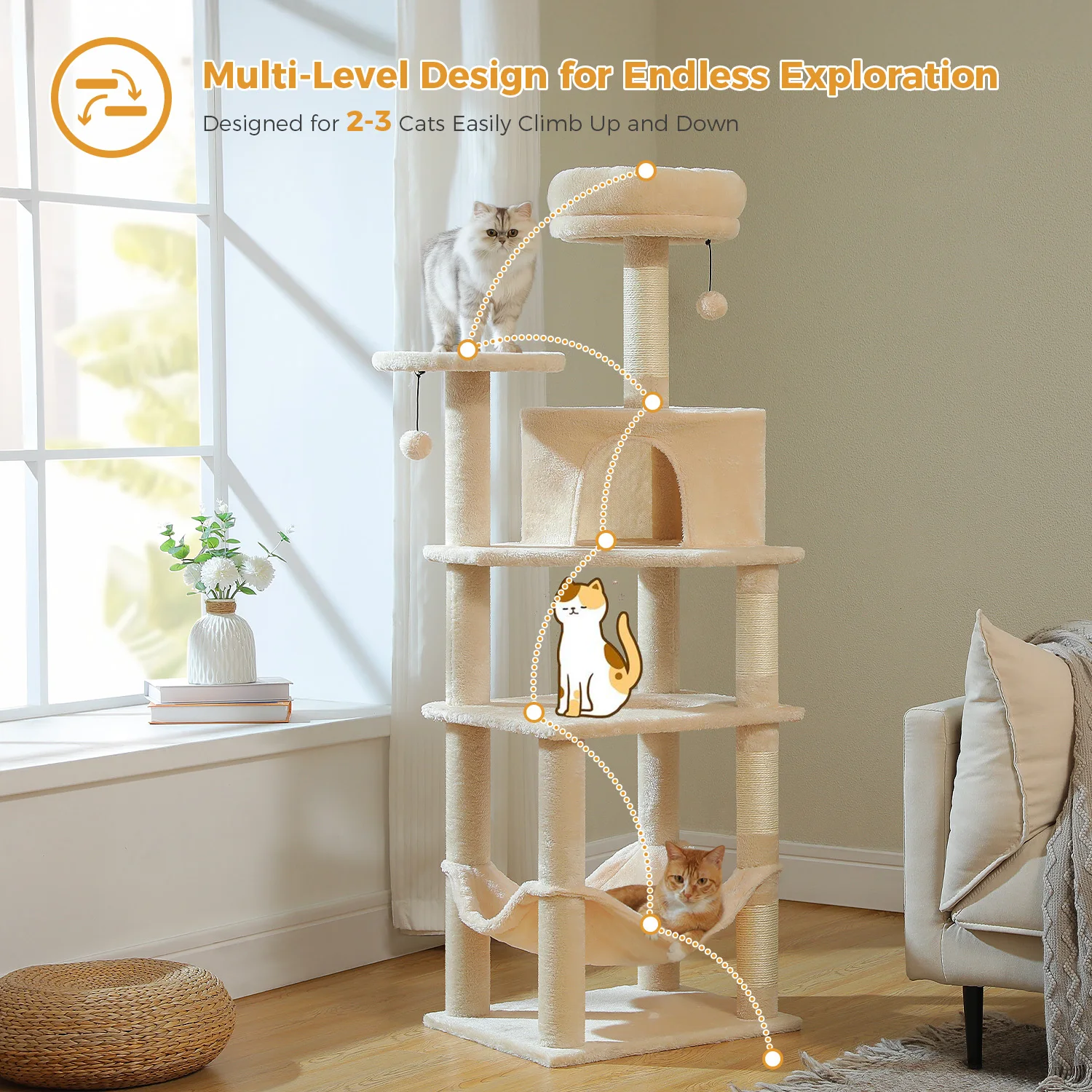 Torre de árbol para gatos de 6 niveles con hamaca súper grande, condominio espacioso, kit antivuelco, 2 bolas colgantes, 4 postes rascadores de sisal natural