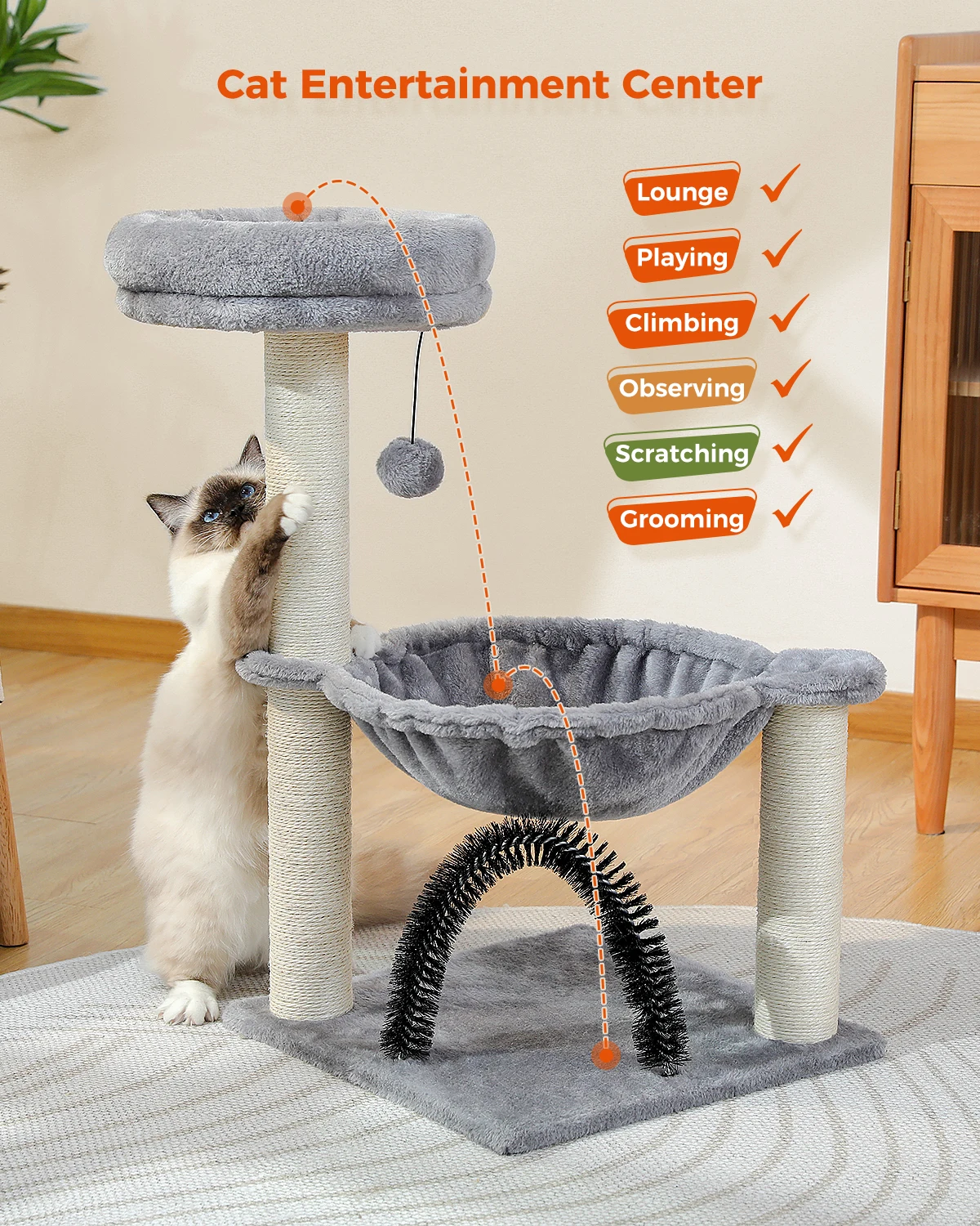 El cepillo de aseo y la bola colgante ofrecen más diversión para los gatos.