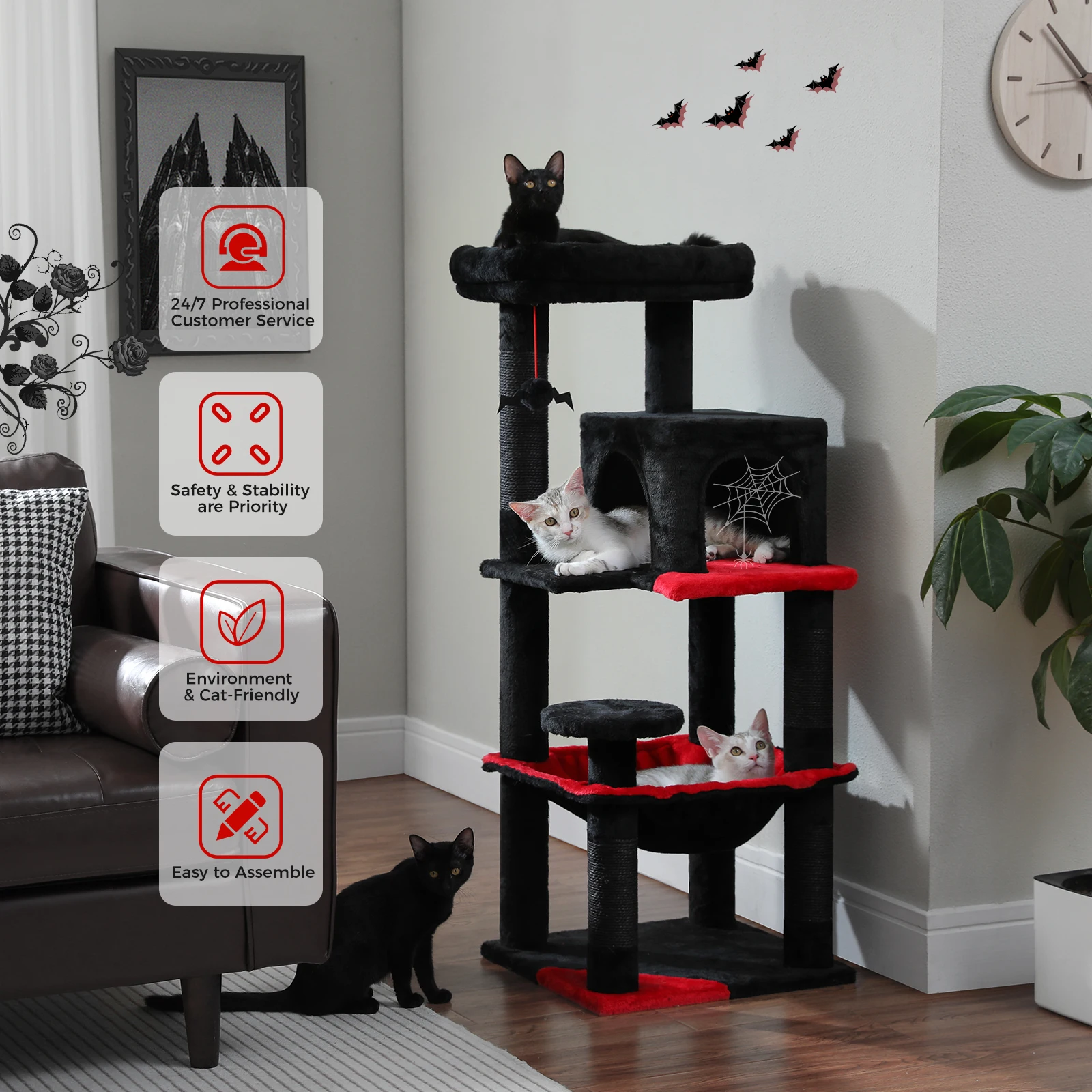 Torre gótica de árbol para gatos de 4 niveles de 116 cm para gatos de interior con marco de metal resistente, hamaca, condominio, perca y 4 postes de sisal en color negro