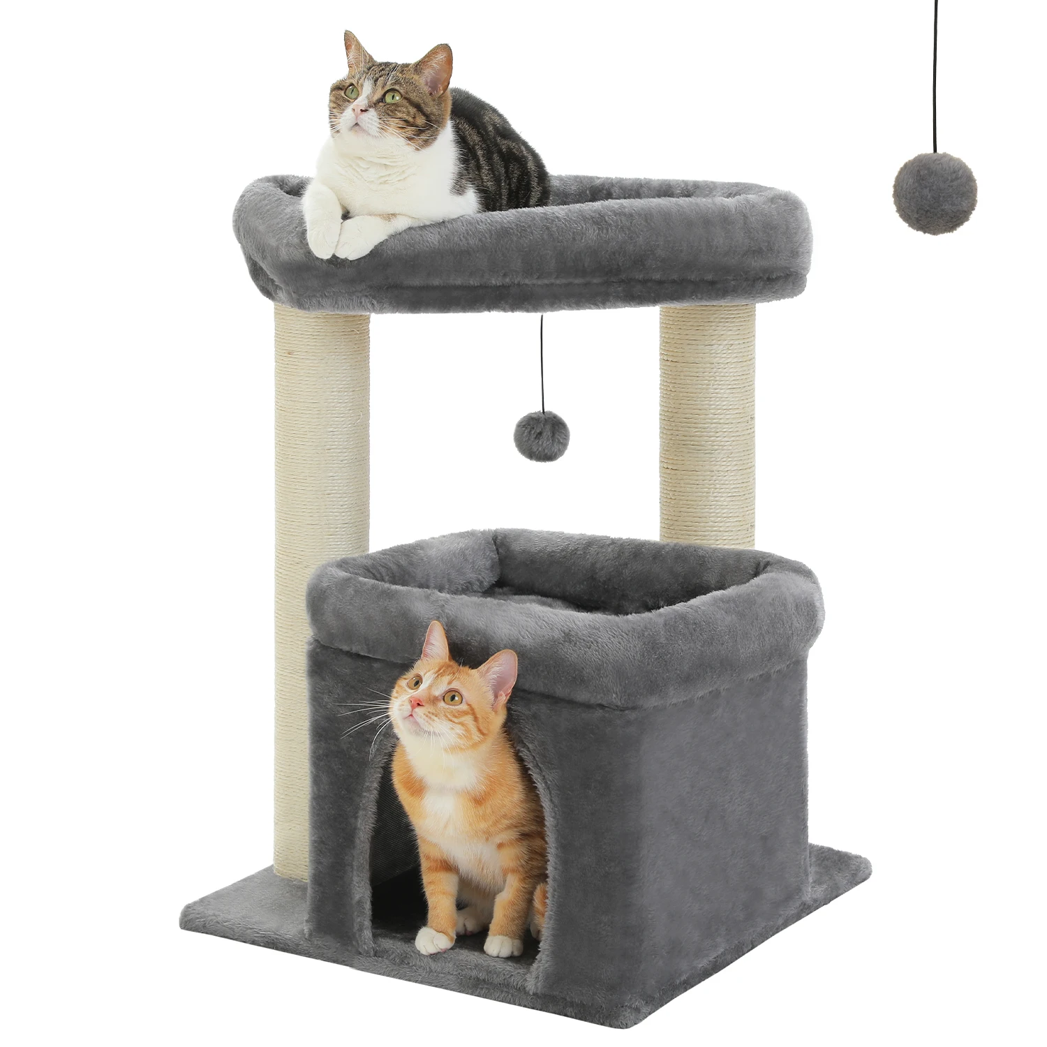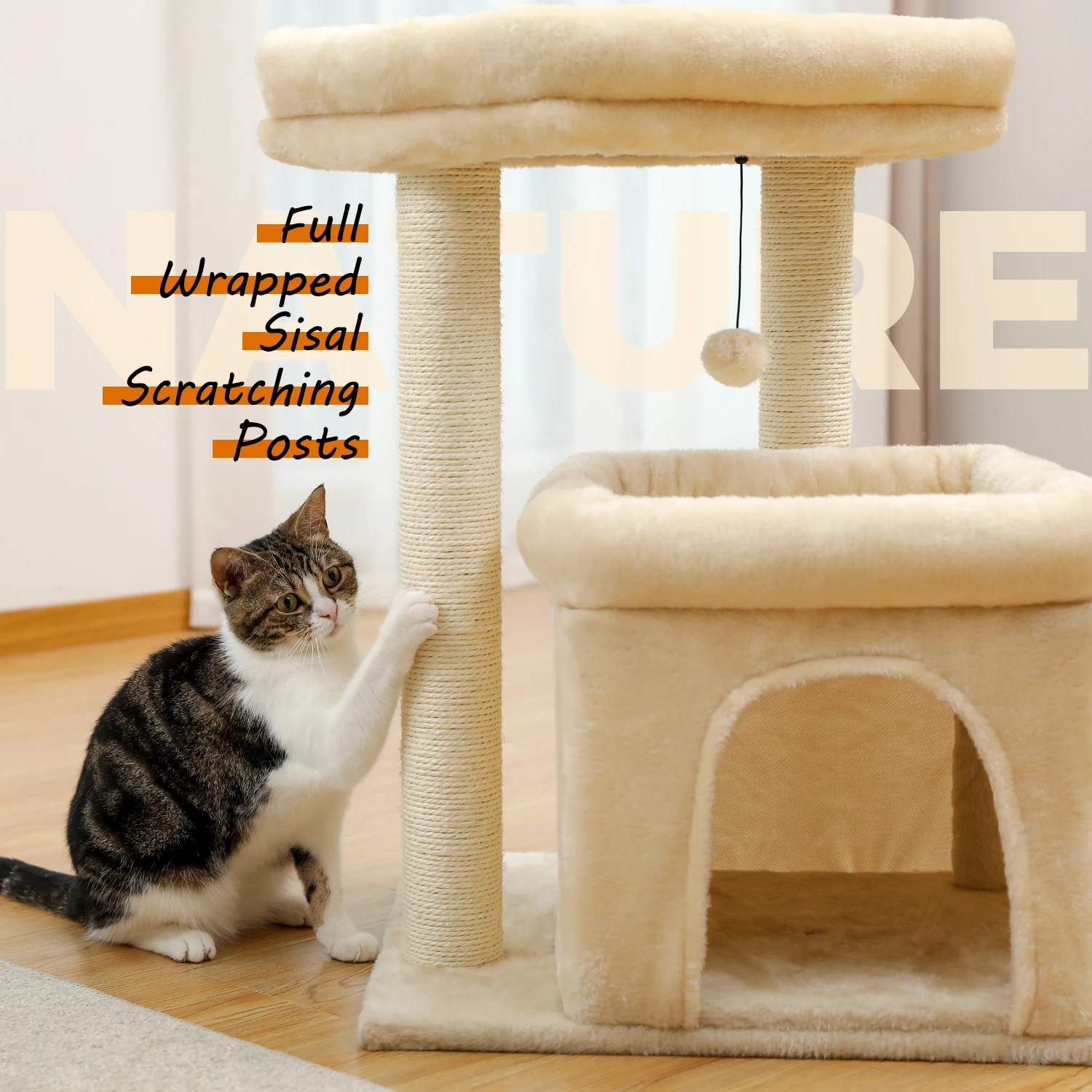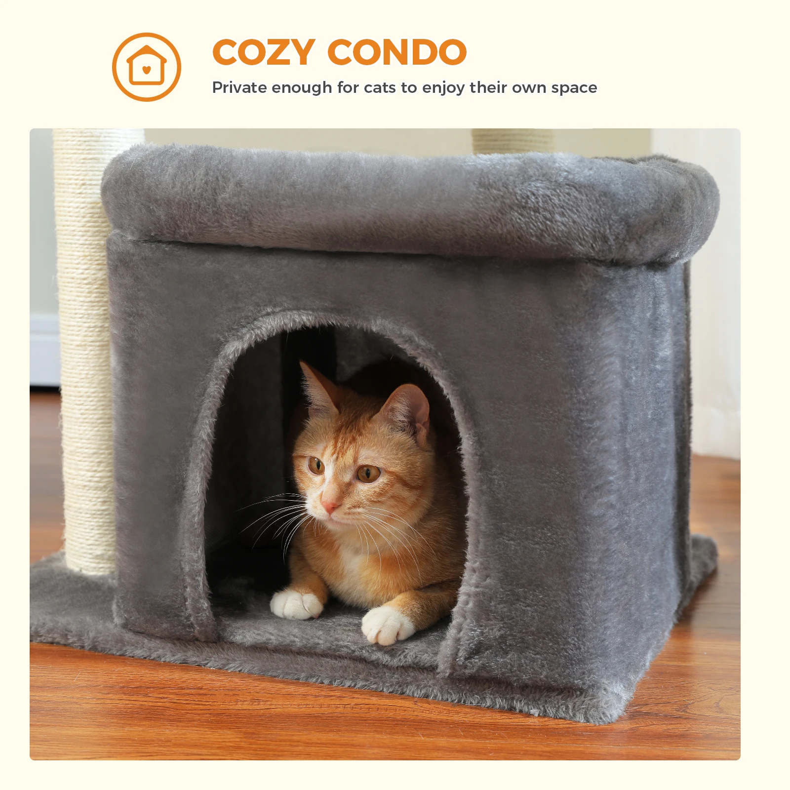 CALIDAD SUPERIOR:Compuestos por tablero de alta calidad con certificación CARB y tela de felpa, el condominio y las perchas son muy suaves y cómodos, a los miembros peludos de su familia les encantará el toque lujoso y disfrutarán explorando y olveneciendo por su nueva casa.Los postes rascadores reforzados están cubiertos por una cuerda de sisal natural: un tipo de material saludable que a tus gatos les encantará porque se siente mucho como rascarse la corteza de los árboles.