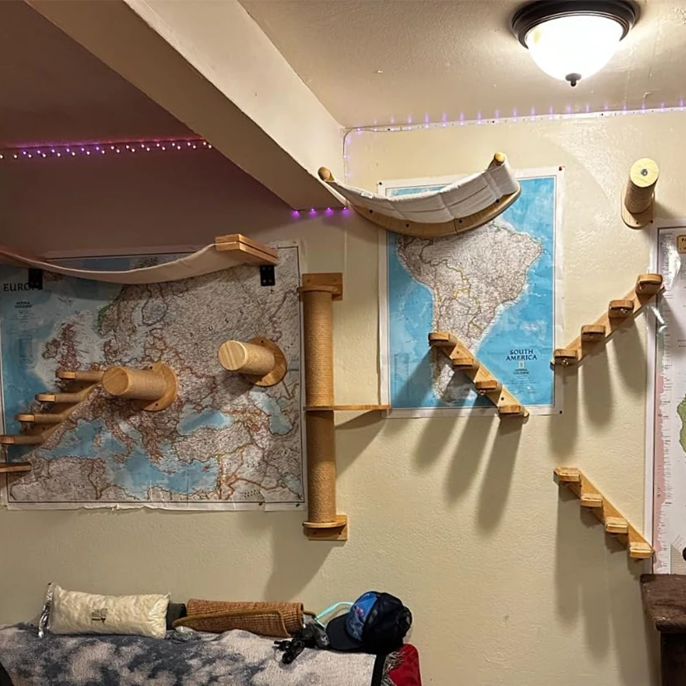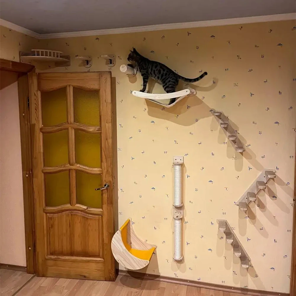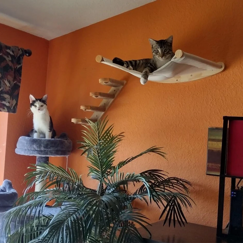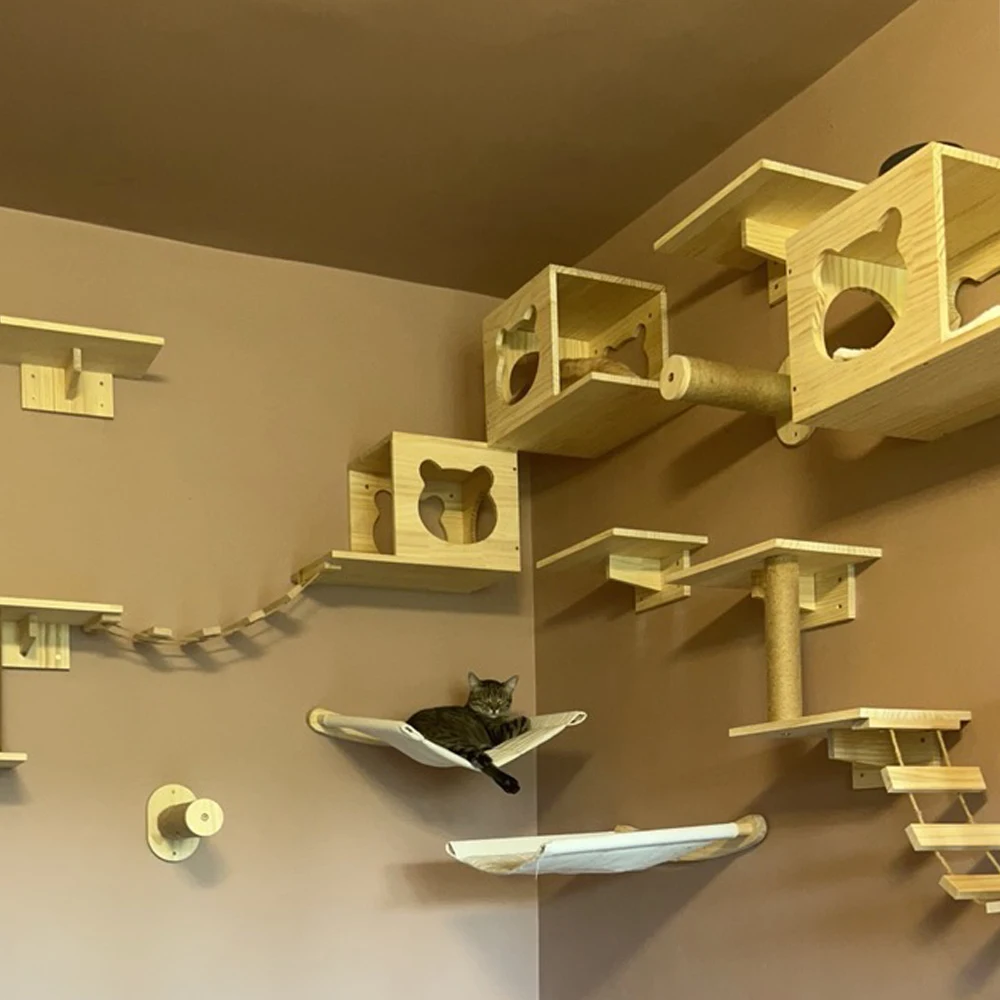 Los estantes de pared para gatos satisfacen el hábito de los gatos de escalar, aumentando el ejercicio y reduciendo la posibilidad de obesidad, lo que es bueno para la salud. Además, le da a los gatos espacio para trepar y evitar estropear el hogar.