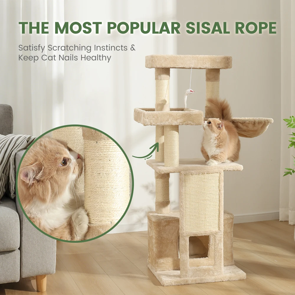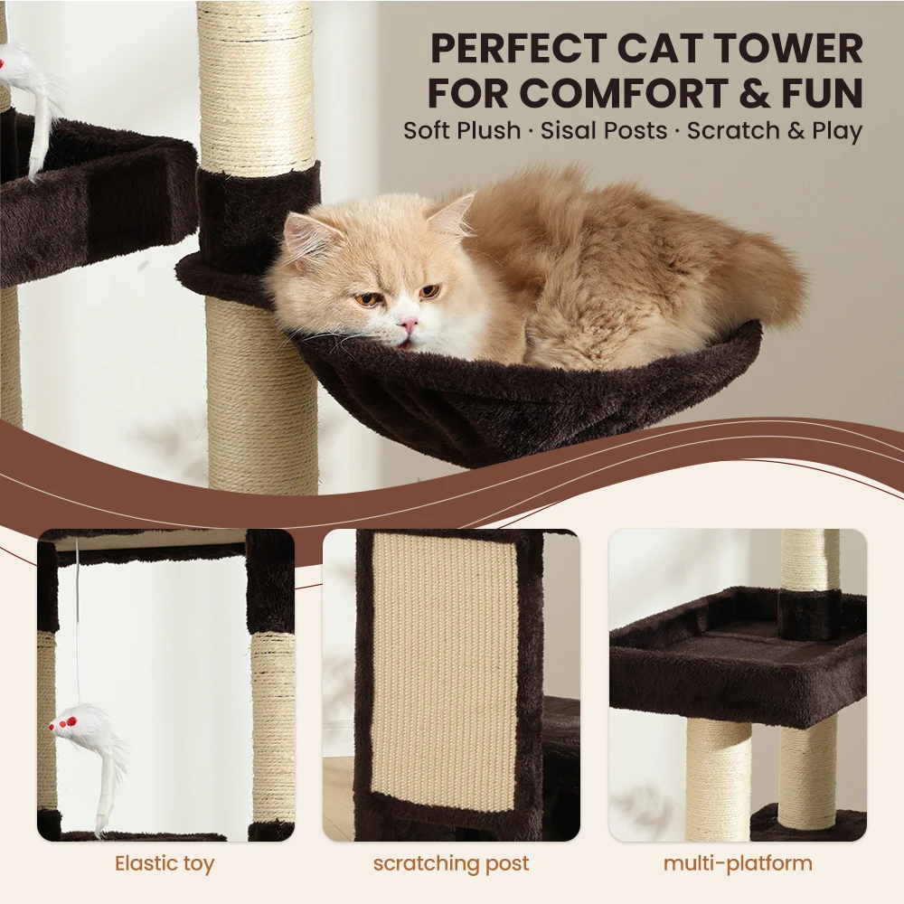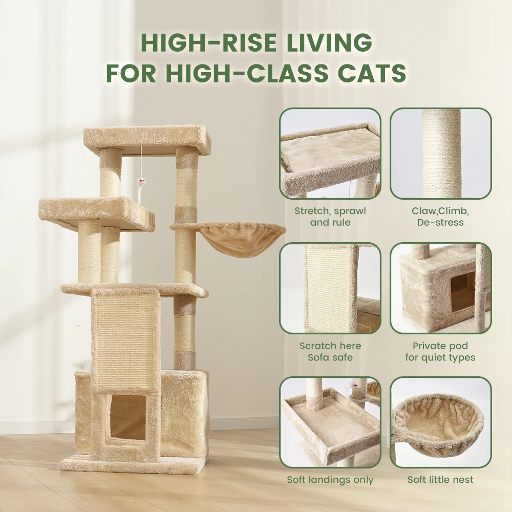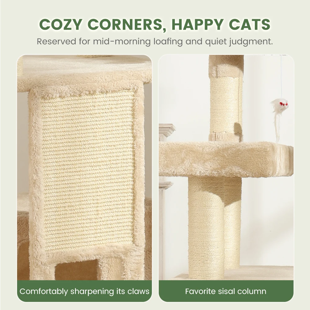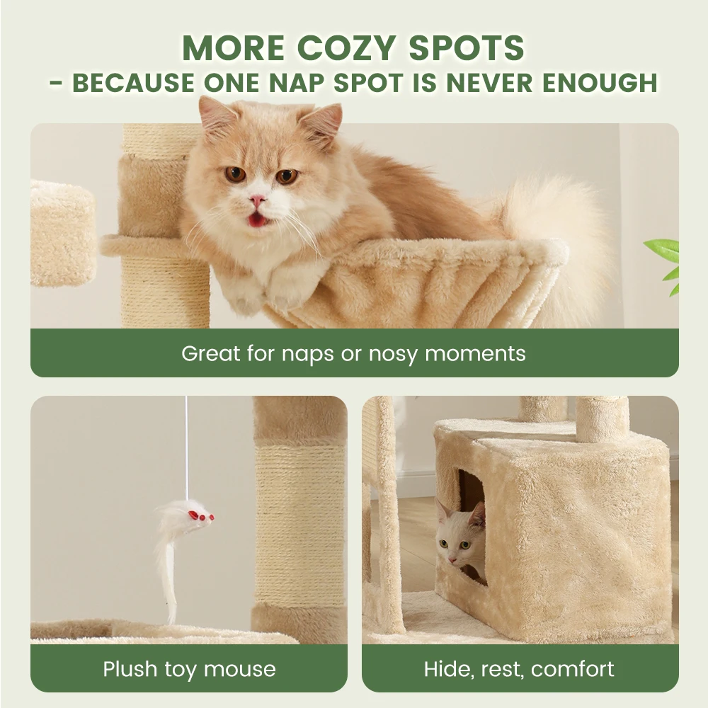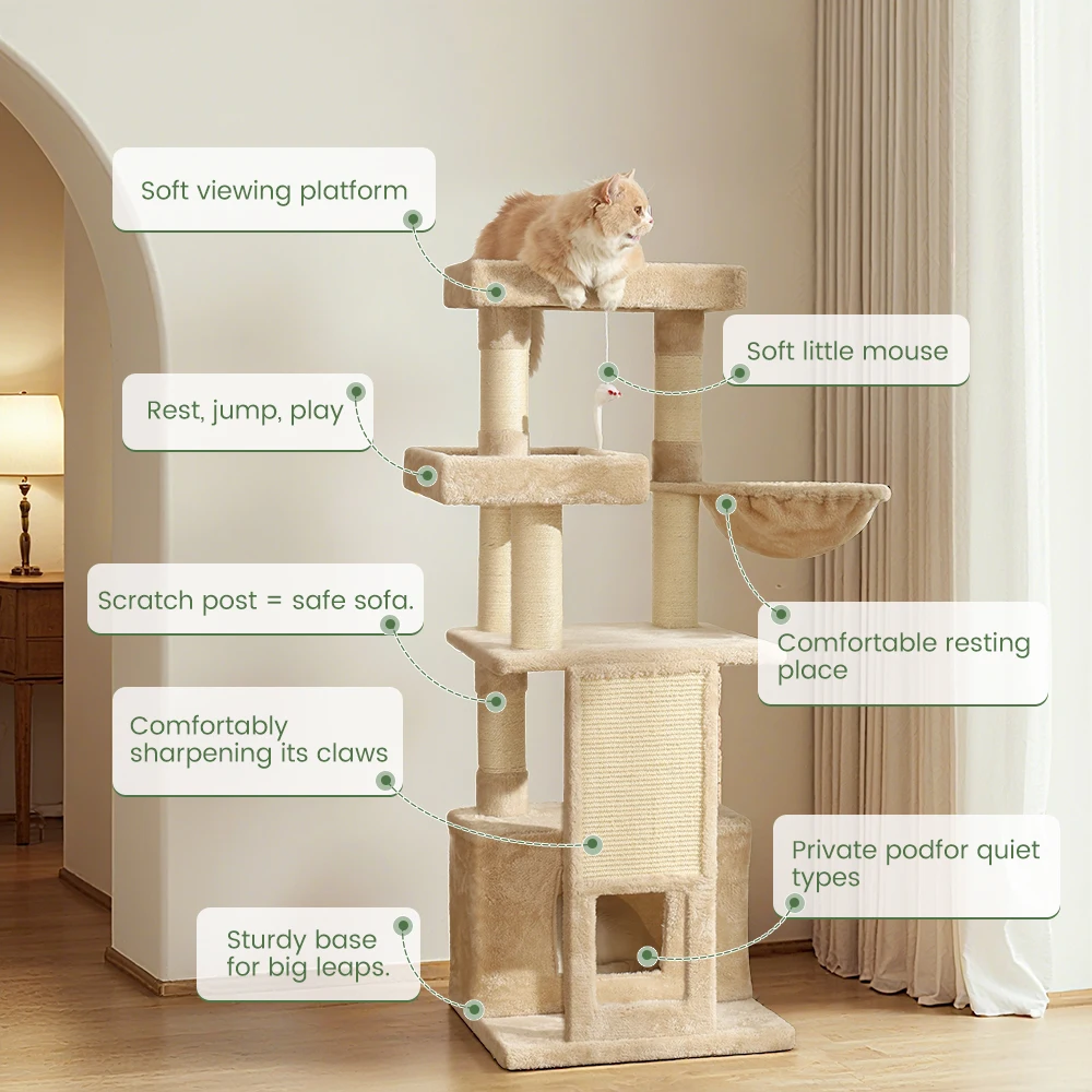 Estación de juegos integral: rascarse, saltar, esconderse y dormir.¡Una colección de prácticos tiradores, plataformas de salto de varios niveles y acogedores apartamentos privados!Satisfacendo los instintos de rechinar las garras de los gatos, liberando su energía de salto y proporcionándoles un lugar de descanso, una torre para gatos puede cuidar sus necesidades diarias y hacerlas felices durante todo el día.