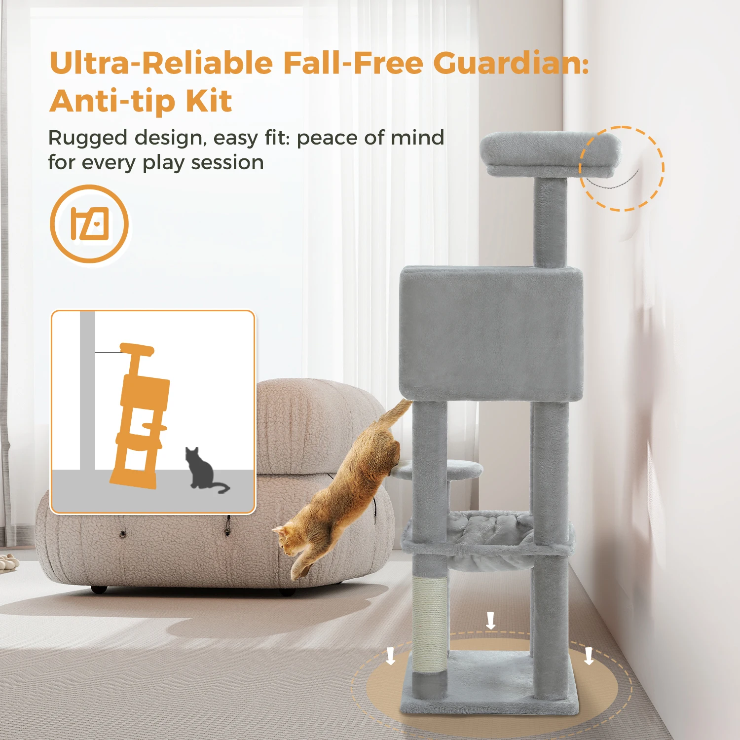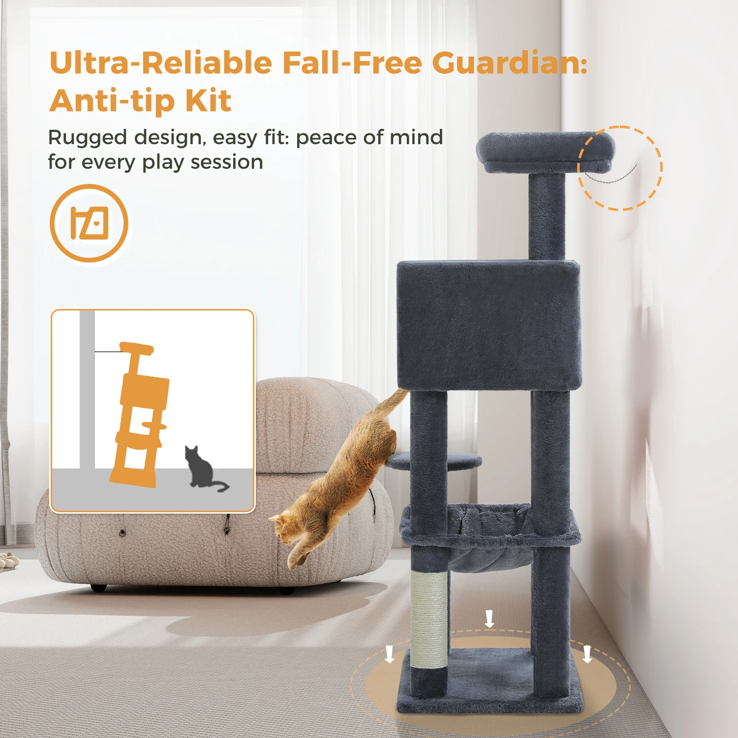 Espacio de exploración de varios niveles: El diseño de 5 niveles (113 cm de alto) ofrece un amplio espacio vertical para que los gatos trepen, salten y percan, satisfaciendo su instinto natural para explorar y investigar su entorno desde puntos de alta venta como la percha superior.Esta estructura en capas fomenta la actividad física, ayudando a los gatos de interior a mantenerse activos y a mantener un peso saludable mientras navegan entre diferentes niveles durante todo el día.Diseño seguro y estable: Viene con un kit antivuelco para garantizar que el árbol para gatos permanezca seguro en su lugar, incluso cuando los gatos enérgicos trepen o saltan, lo que lo convierte en una opción confiable para uso en interiores.El kit incluye herrajes que ancla el árbol a una pared, eliminando el riesgo de que se vuelque durante el juego vigoroso, mientras que la base estable y la estructura equilibrada añaden una capa adicional de seguridad para gatos de todos los tamaños.