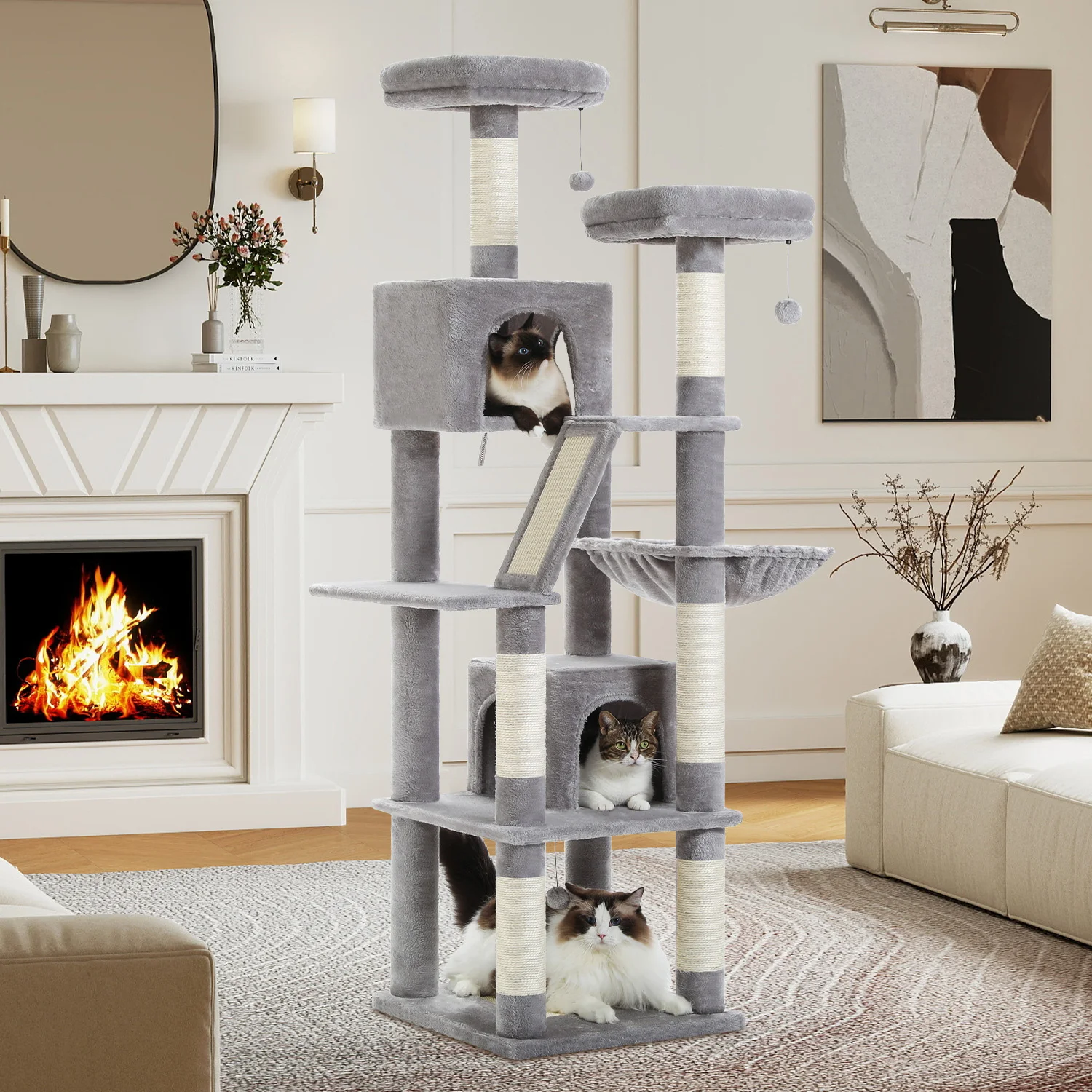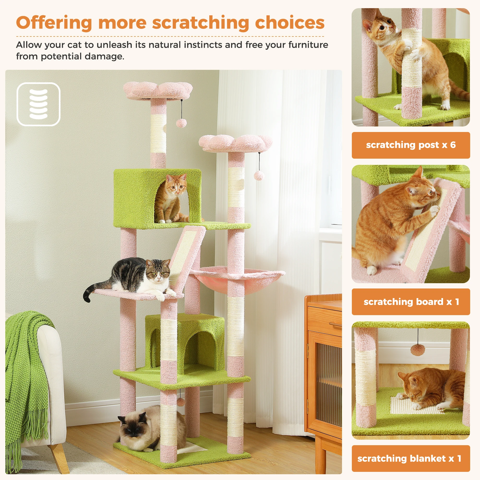 Parque infantil para gatos de varios niveles:Diseñada con múltiples niveles, esta torre para gatos de 70,9" de alto proporciona un amplio espacio vertical para que sus gatos exploren y satisfagan sus instintos naturales y sus necesidades de actividad.Este árbol para gatos cuenta con 6 postes para rascar, 2 tablas para rascar, 2 pompones, 2 condominios, 1 hamaca y 2 perchas, para satisfacer las diversas necesidades de varios gatos simultáneamente.