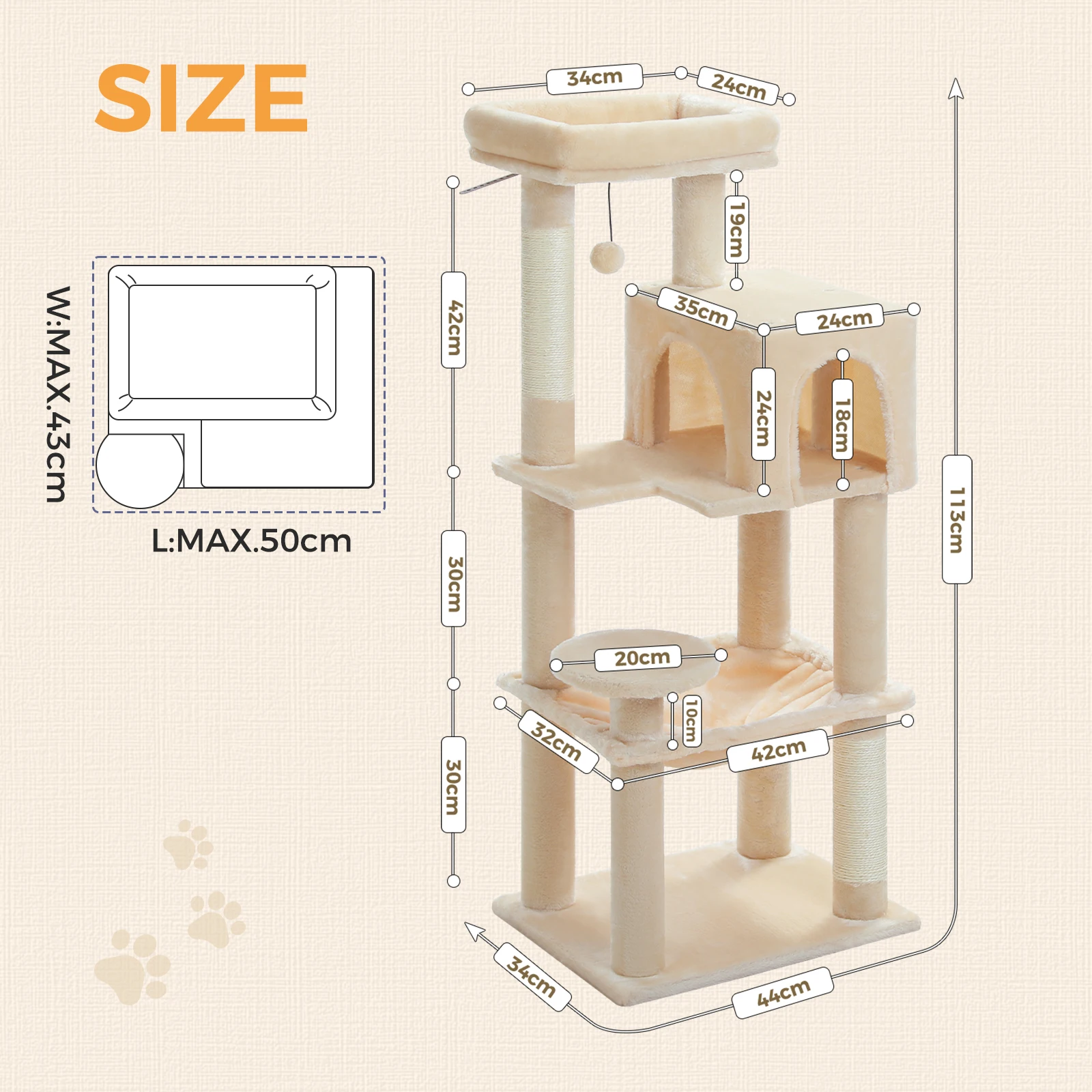 Árbol para gatos de 5 niveles, torre para gatos de 113 cm con percha superior, condondo suave, poste para rascar de sisal natural, pompón atractivo, kit antivuelco, hamaca