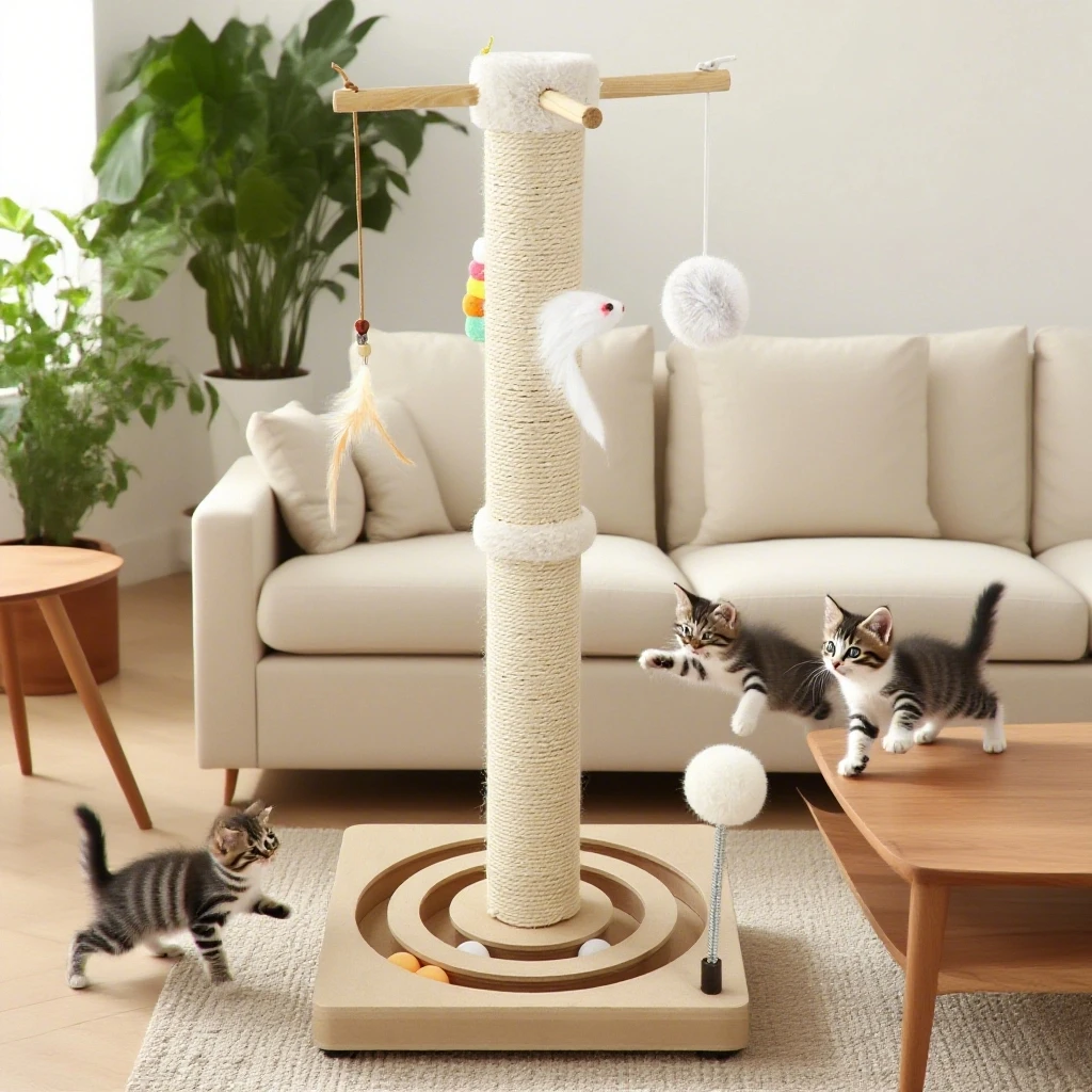 ●En la barra horizontal que se extiende desde la parte superior del rascador para gatos, hay pequeños juguetes coloridos y diversos colgados.Hay plumas ligeras que se balancean suavemente con la brisa, como los elfos bailando en el bosque, despertando la curiosidad de los gatos;Hay bolas peludas con una forma redonda que hace que el gato no pueda resistirse a alcanzar sus patas para que se ataquen sobre ellas;También hay lindos juguetes con forma de ratoncito con narices rojas y ojos negros, que son realistas e interesantes, inspirando la naturaleza de caza de los gatos y permitiéndoles disfrutar al máximo de la alegría de perseguir y jugar.